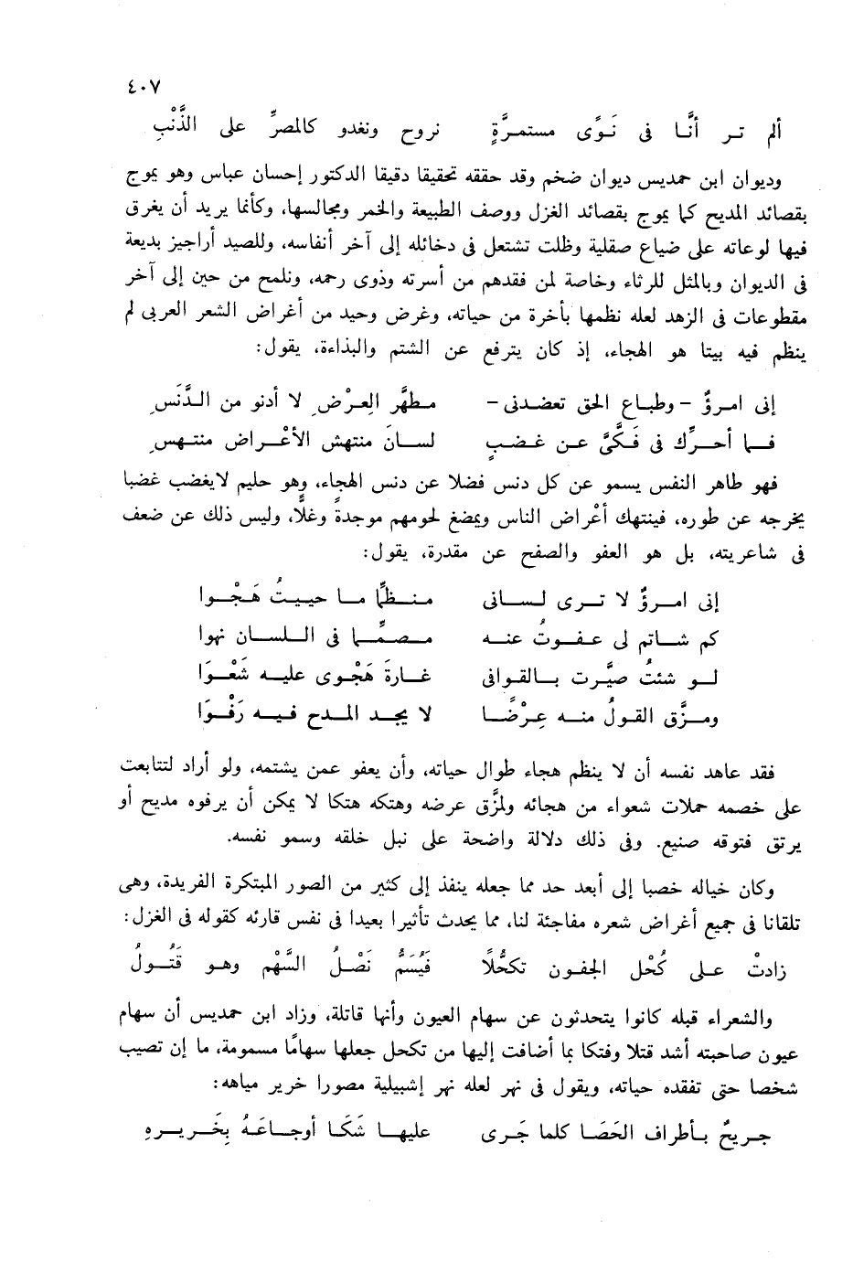 وديوان ابن حمديس ديوان ضخم وقد حققه تحقيقا دقيقا الدكتور إحسان عباس وهو يموج بقصائد المديح كما يموج بقصائد الغزل ووصف الطبيعة والخمر ومجالسها، وكأنما يريد أن يغرق فيها لوعاته على ضياع صقلية وظلت تشتعل فى دخائله إلى آخر أنفاسه، وللصيد أراجيز بديعة فى الديوان وبالمثل للرثاء وخاصة لمن فقدهم من أسرته وذوى رحمه، ونلمح من حين إلى آخر مقطوعات فى الزهد لعله نظمها بأخرة من حياته، وغرض وحيد من أغراض الشعر العربى لم ينظم فيه بيتا هو الهجاء، إذ كان يترفع عن الشتم والبذاءة، يقول: