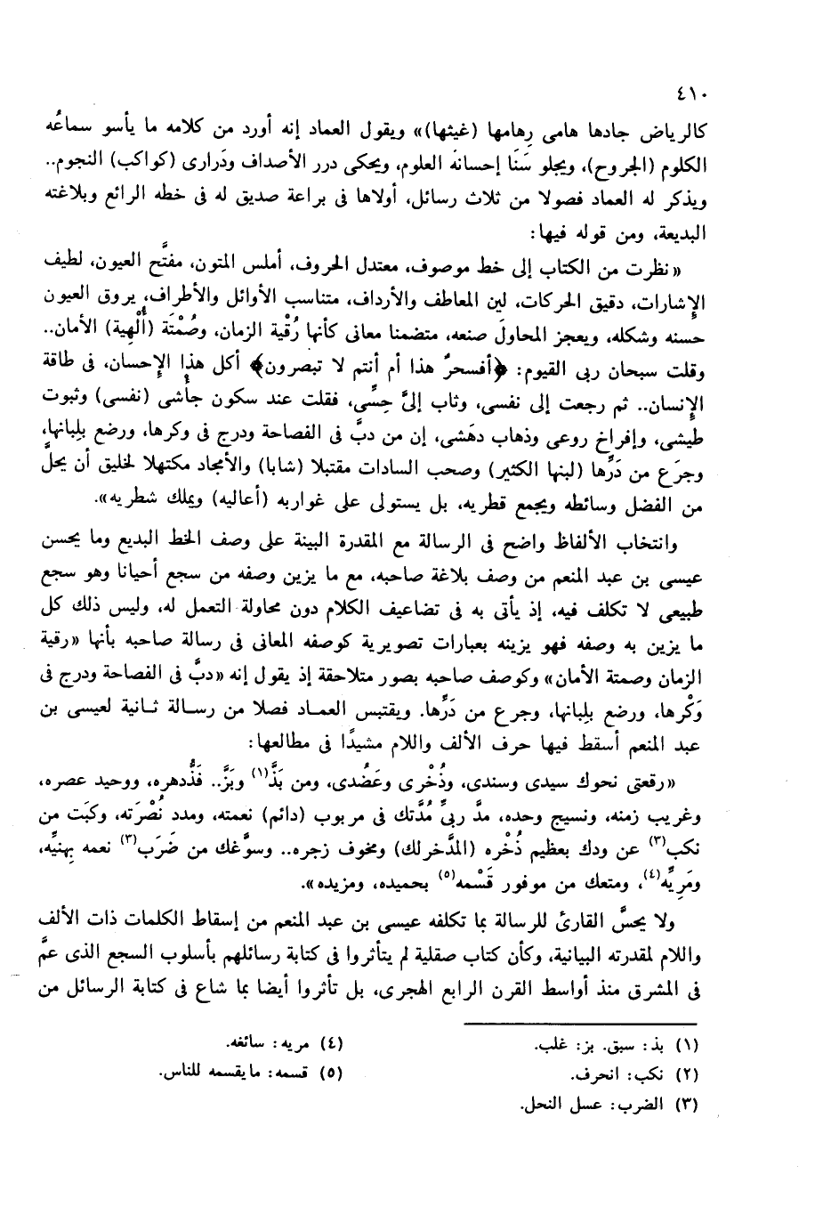 وانتخاب الألفاظ واضح فى الرسالة مع المقدرة البينة على وصف الخط البديع وما يحسن عيسى بن عبد المنعم من وصف بلاغة صاحبه، مع ما يزين وصفه من سجع أحيانا وهو سجع طبيعى لا تكلف فيه، إذ يأتى به فى تضاعيف الكلام دون محاولة التعمل له، وليس ذلك كل ما يزين به وصفه فهو يزينه بعبارات تصويرية كوصفه المعانى فى رسالة صاحبه بأنها «رقية الزمان وصمتة الأمان» وكوصف صاحبه بصور متلاحقة إذ يقول إنه «دبّ فى الفصاحة ودرج فى وكرها، ورضع بلبانها، وجرع من درّها. ويقتبس العماد فصلا من رسالة ثانية لعيسى بن عبد المنعم أسقط فيها حرف الألف واللام مشيدا فى مطالعها: