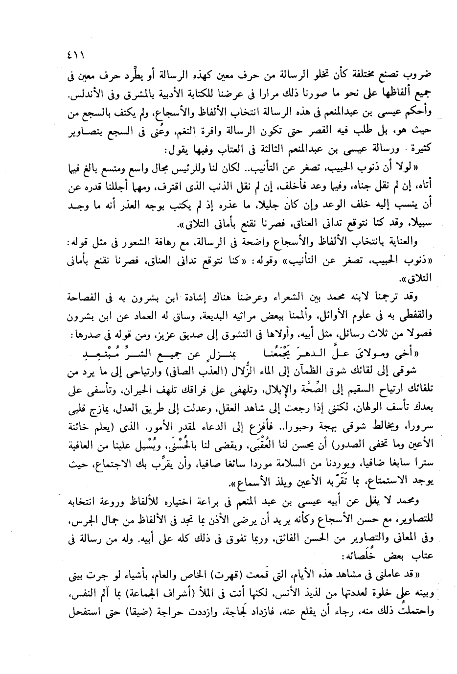 وأحكم عيسى بن عبد المنعم فى هذه الرسالة انتخاب الألفاظ والأسجاع، ولم يكتف بالسجع من حيث هو، بل طلب فيه القصر حتى تكون الرسالة وافرة النغم، وعنى فى السجع بتصاوير كثيرة. ورسالة عيسى بن عبد المنعم الثالثة فى العتاب وفيها يقول: