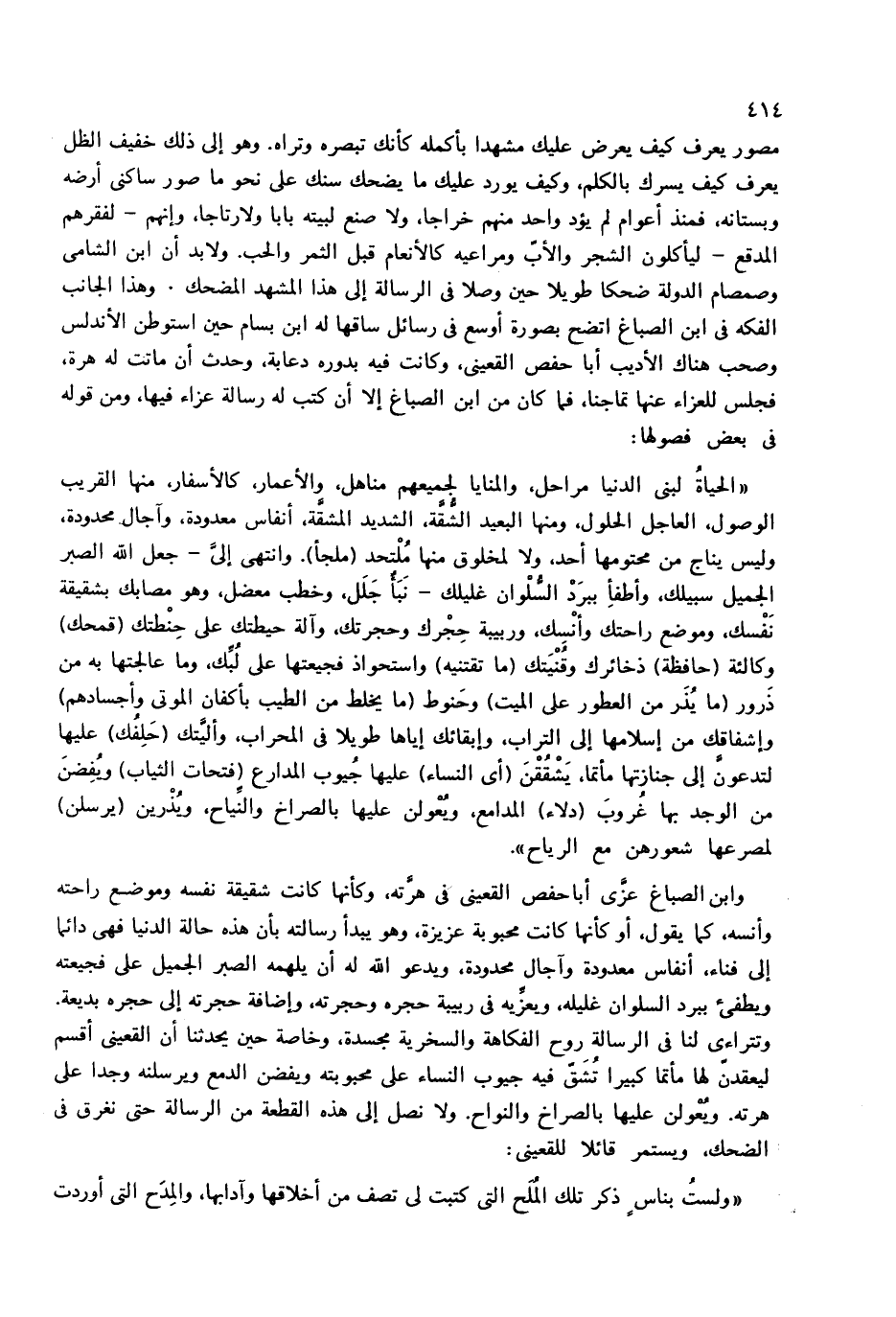 وابن الصباغ عزّى أبا حفص القعينى فى هرّته، وكأنها كانت شقيقة نفسه وموضع راحته وأنسه، كما يقول، أو كأنها كانت محبوبة عزيزة، وهو يبدأ رسالته بأن هذه حالة الدنيا فهى دائما إلى فناء، أنفاس معدودة وآجال محدودة، ويدعو الله له أن يلهمه الصبر الجميل على فجيعته ويطفئ ببرد السلوان غليله، ويعزّيه فى ربيبة حجره وحجرته، وإضافة حجرته إلى حجره بديعة.