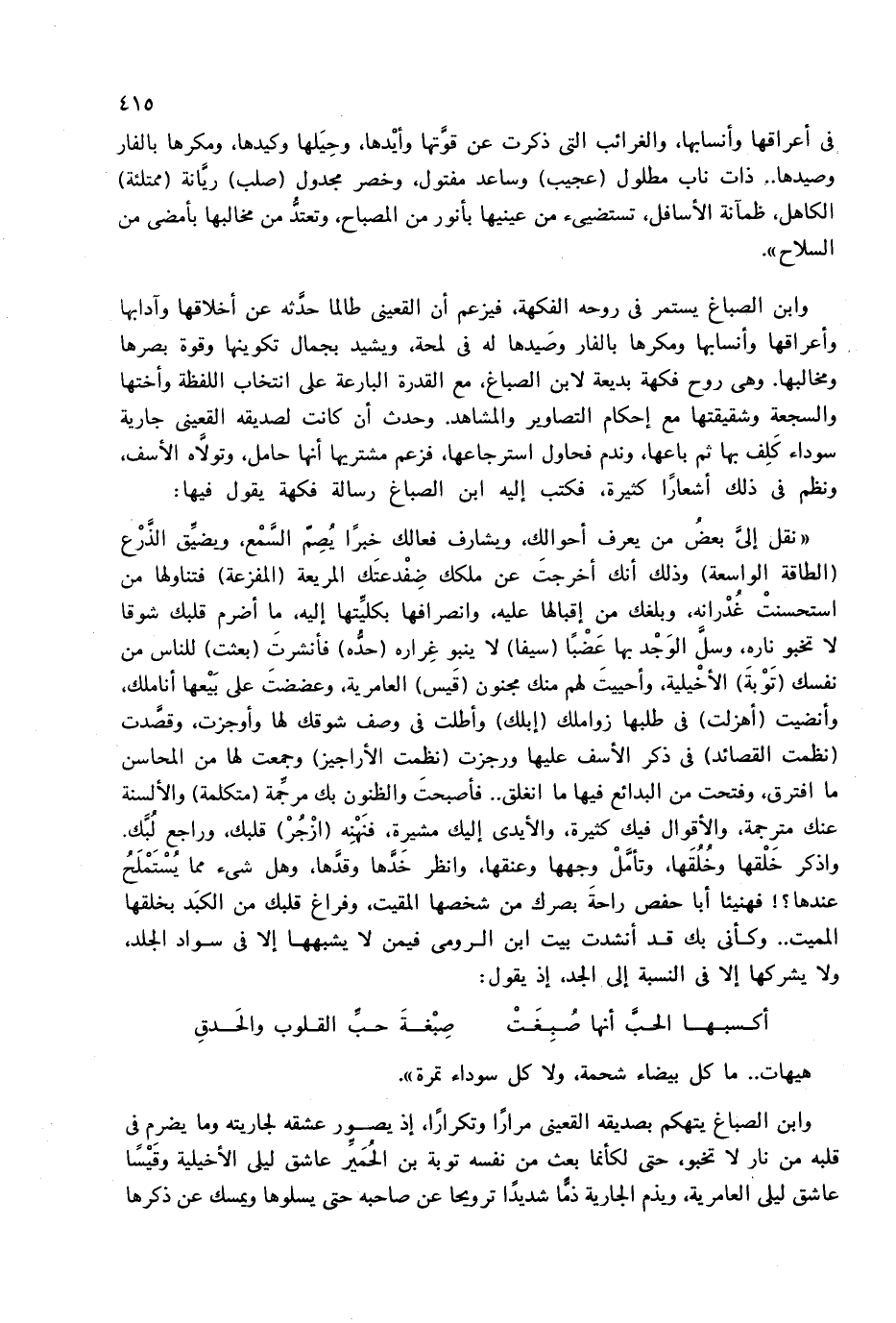 «نقل إلىّ بعض من يعرف أحوالك، ويشارف فعالك خبرا يصمّ السّمع، ويضيّق الذّرع (الطاقة الواسعة) وذلك أنك أخرجت عن ملكك ضفدعتك المريعة (المفزعة) فتناولها من استحسنت غدرانه، وبلغك من إقبالها عليه، وانصرافها بكليّتها إليه، ما أضرم قلبك شوقا لا تخبو ناره، وسلّ الوجد بها عضبا (سيفا) لا ينبو غراره (حدّه) فأنشرت (بعثت) للناس من نفسك (توبة) الأخيلية، وأحييت لهم منك مجنون (قيس) العامرية، وعضضت على بيعها أناملك، وأنضيت (أهزلت) فى طلبها زواملك (إبلك) وأطلت فى وصف شوقك لها وأوجزت، وقصّدت (نظمت القصائد) فى ذكر الأسف عليها ورجزت (نظمت الأراجيز) وجمعت لها من المحاسن ما افترق، وفتحت من البدائع فيها ما انغلق. . فأصبحت والظنون بك مرجّمة (متكلمة) والألسنة عنك مترجمة، والأقوال فيك كثيرة، والأيدى إليك مشيرة، فنهنه (ازجر) قلبك، وراجع لبّك.