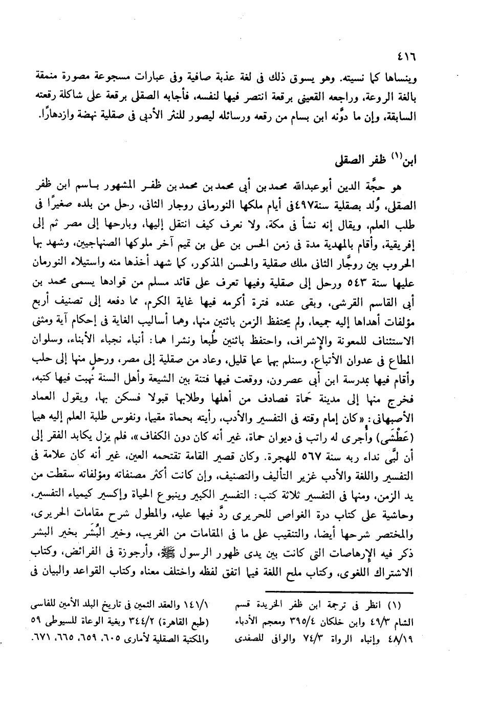 (¬1) انظر فى ترجمة ابن ظفر الخريدة قسم الشام 3/ 49 وابن خلكان 4/ 395 ومعجم الأدباء 19/ 48 وإنباه الرواة 3/ 74 والوافى للصفدى 1/ 141 والعقد الثمين فى تاريخ البلد الأمين للفاسى (طبع القاهرة) 2/ 344 وبغية الوعاة للسيوطى 59 والمكتبة الصقلية لأمارى 605، 659، 665، 671.