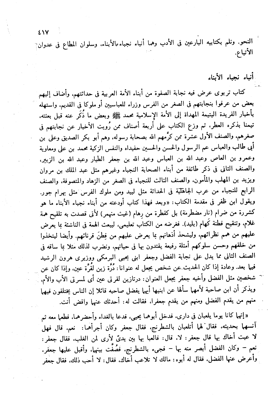 كتاب تربوى عرض فيه نجابة الصفوة من أبناء الأمة العربية فى حداثتهم، وأضاف إليهم بعض من عرفوا بنجابتهم فى الصغر من الفرس وزراء للعباسيين أو ملوكا فى القديم، واستهله بأخبار الفريدة اليتيمة المهداة إلى الأمة الإسلامية محمد صلّى الله عليه وسلّم وبعض ما ذكر عنه قبل بعثته، تيمنا بذكره العطر، ثم وزع الكتاب على أربعة أصناف ممن رويت الأخبار عن نجابتهم فى صغرهم، والصنف الأول عشرة ممن كرّمهم الله بصحابة رسوله، وهم أبو بكر الصديق وعلى بن أبى طالب والعباس عم الرسول والحسن والحسين حفيداه والنفس الزكية محمد بن على ومعاوية وعمرو بن العاص وعبد الله بن العباس وعبد الله بن جعفر الطيار وعبد الله بن الزبير، والصنف الثانى فى ذكر طائفة من أبناء الصحابة النجباء وغيرهم مثل عبد الملك بن مروان ويزيد بن المهلب والمأمون، والصنف الثالث للنجباء فى الصغر من الزهاد والمتصوفة، والصنف الرابع للنجباء من عرب الجاهلية فى الحداثة مثل لبيد ومن ملوك الفرس مثل بهرام جور.