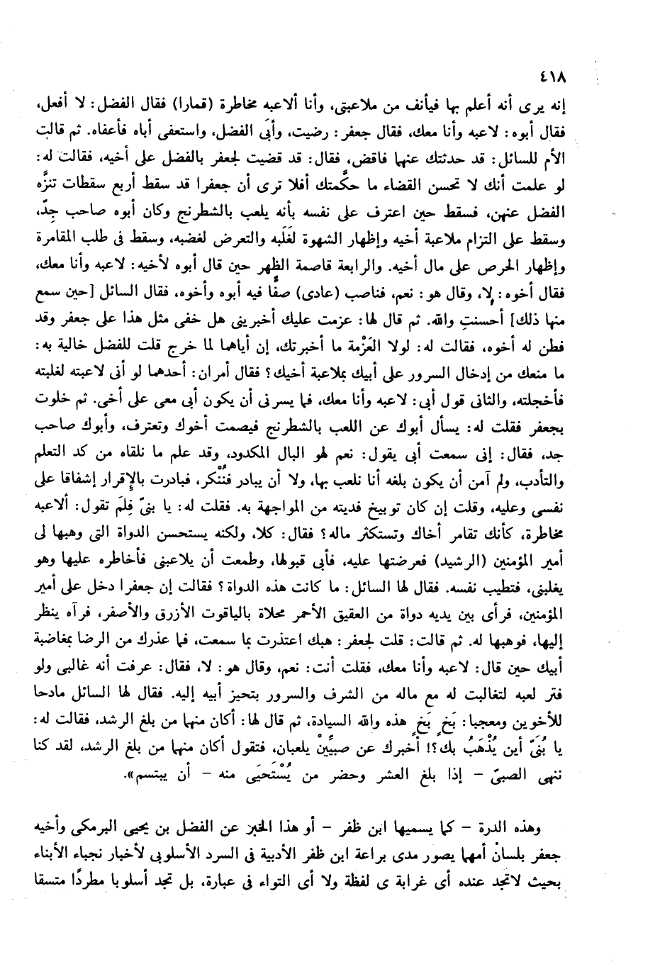 إنه يرى أنه أعلم بها فيأنف من ملاعبتى، وأنا ألاعبه مخاطرة (قمارا) فقال الفضل: لا أفعل، فقال أبوه: لاعبه وأنا معك، فقال جعفر: رضيت، وأبى الفضل، واستعفى أباه فأعفاه. ثم قالت الأم للسائل: قد حدثتك عنهما فاقض، فقال: قد قضيت لجعفر بالفضل على أخيه، فقالت له: