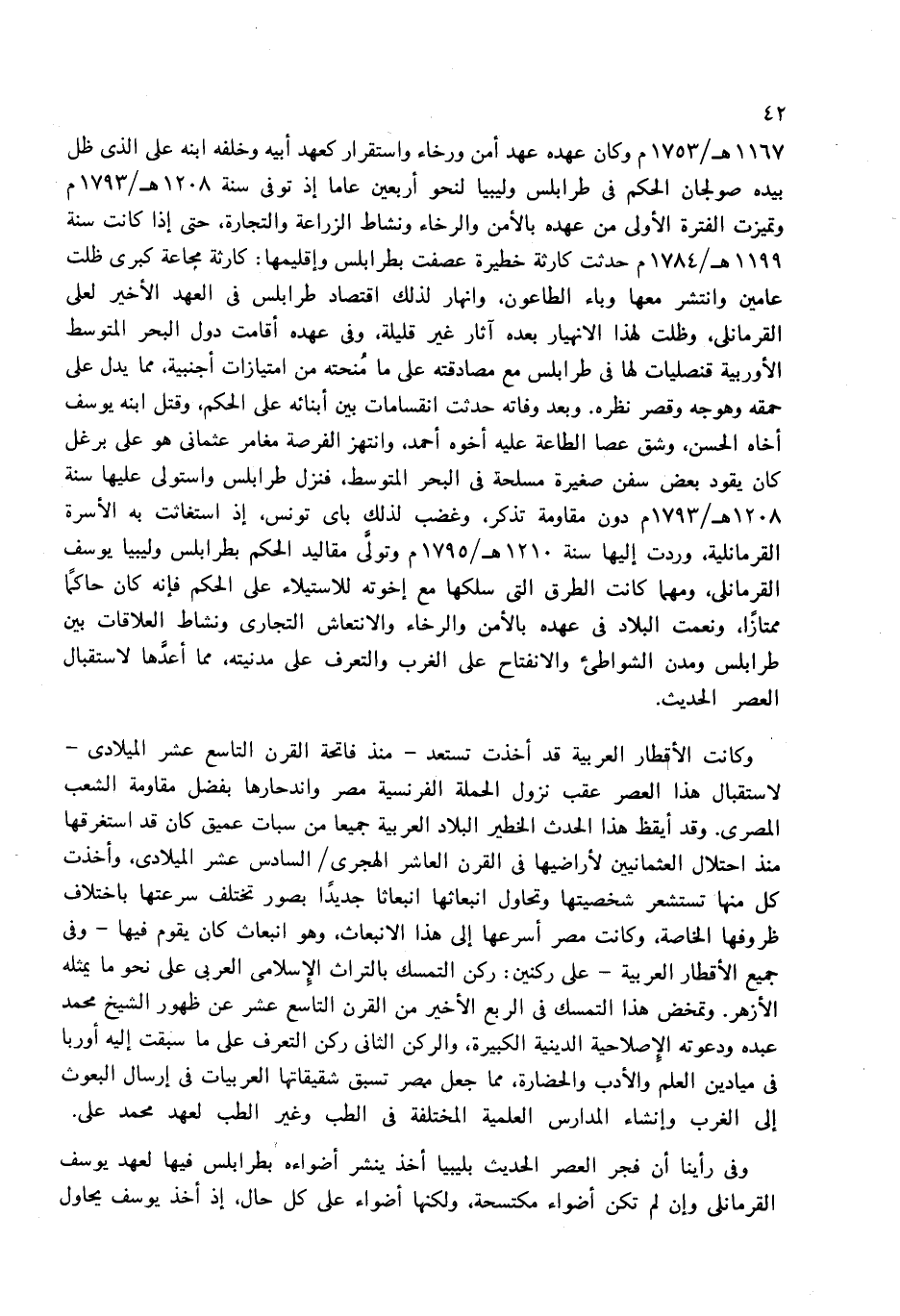 وفى رأينا أن فجر العصر الحديث بليبيا أخذ ينشر أضواءه بطرابلس فيها لعهد يوسف القرمانلى وإن لم تكن أضواء مكتسحة، ولكنها أضواء على كل حال، إذ أخذ يوسف يحاول