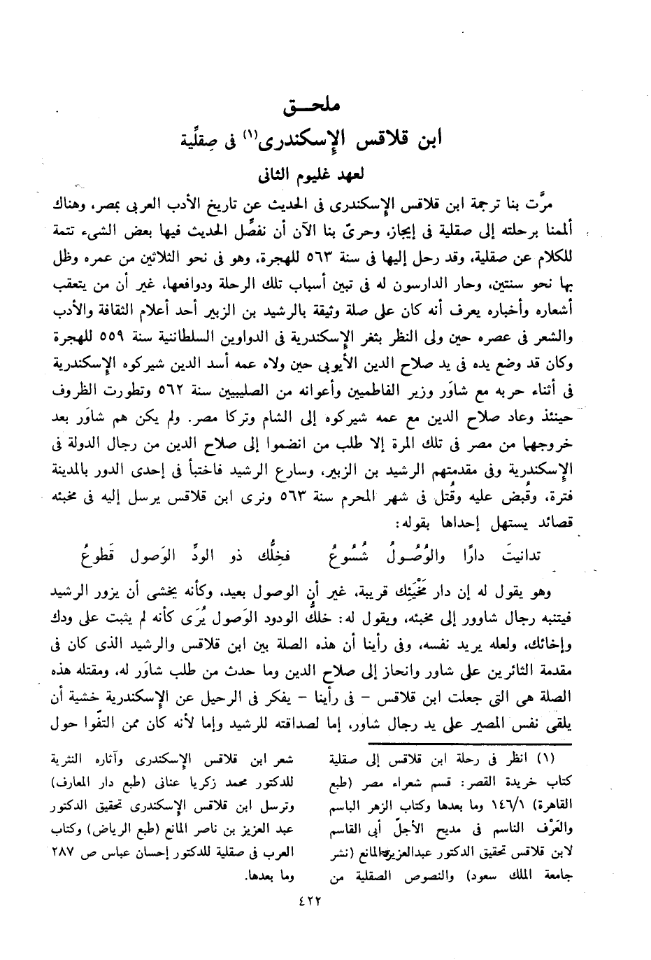 وهو يقول له إن دار مخبئك قريبة، غير أن الوصول بعيد، وكأنه يخشى أن يزور الرشيد فيتنبه رجال شاوور إلى مخبئه، ويقول له: خلك الودود الوصول يرى كأنه لم يثبت على ودك وإخائك، ولعله يريد نفسه، وفى رأينا أن هذه الصلة بين ابن قلاقس والرشيد الذى كان فى مقدمة الثائرين على شاور وانحاز إلى صلاح الدين وما حدث من طلب شاور له، ومقتله هذه الصلة هى التى جعلت ابن قلاقس-فى رأينا-يفكر فى الرحيل عن الإسكندرية خشية أن يلقى نفس المصير على يد رجال شاور، إما لصداقته للرشيد وإما لأنه كان ممن التفّوا حول