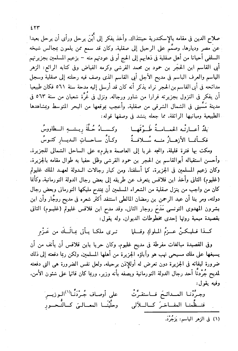 صلاح الدين فى مقامه بالإسكندرية حينذاك. وأخذ يفكر إلى أين يرحل ورأى أن يرحل بعيدا عن مصر وديارها، وصمّم على الرحيل إلى صقلية، وكان قد سمع ممن يلمون بمجالس شيخه السلفى أحيانا من أهل صقلية فى ذهابهم إلى الحج أو فى عودتهم منه-بزعيم المسلمين بجزيرتهم أبى القاسم ابن الحجر بن حمود بن محمد القرشى وكرمه الفياض وفى كتابه الرائع: الزهر الباسم والعرف الباسم فى مديح الأجل أبى القاسم الذى وصف فيه رحلته إلى صقلية وسجل مدائحه فى أبى القاسم بن الحجر نراه يذكر أنه كان قد أرسل إليه مدحة سنة 561 فكان طبيعيا أن يفكر فى النزول بجزيرته فرارا من شاور ورجاله. ونزل فى غرّة شعبان من سنة 563 فى مدينة مسّينى فى الشمال الشرقى من صقلية، وأعجب بموقعها من البحر المتوسط وبمشاهدها الطبيعية ومبانيها الرائقة، مما جعله ينشد فى وصفها قوله: