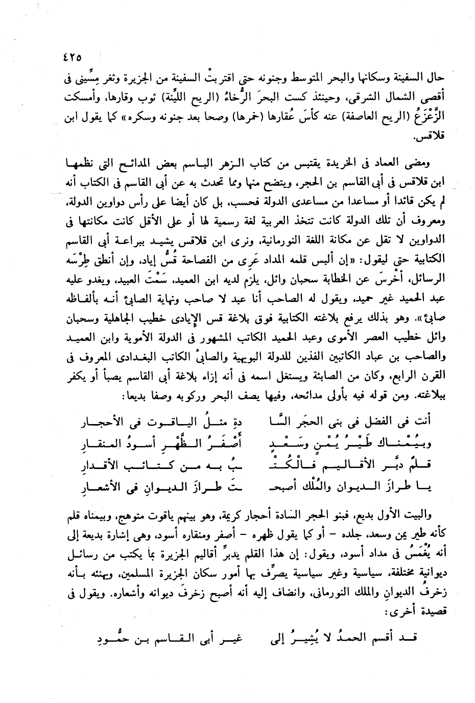 ومضى العماد فى الخريدة يقتبس من كتاب الزهر الباسم بعض المدائح التى نظمها ابن قلاقس فى أبى القاسم بن الحجر، ويتضح منها ومما تحدث به عن أبى القاسم فى الكتاب أنه لم يكن قائدا أو مساعدا من مساعدى الدولة فحسب، بل كان أيضا على رأس دواوين الدولة، ومعروف أن تلك الدولة كانت تتخذ العربية لغة رسمية لها أو على الأقل كانت مكانتها فى الدواوين لا تقل عن مكانة اللغة النورمانية، ونرى ابن قلاقس يشيد ببراعة أبى القاسم الكتابية حتى ليقول: «إن ألبس قلمه المداد عرى من الفصاحة قسّ إياد، وإن أنطق طرسه الرسائل، أخرس عن الخطابة سحبان وائل، يلزم لديه ابن العميد، سمت العبيد، ويغدو عليه عبد الحميد غير حميد، ويقول له الصاحب أنا عبد لا صاحب ونهاية الصابئ أنه بألفاظه صابئ». وهو بذلك يرفع بلاغته الكتابية فوق بلاغة قس الإيادي خطيب الجاهلية وسحبان وائل خطيب العصر الأموى وعبد الحميد الكاتب المشهور فى الدولة الأموية وابن العميد والصاحب بن عباد الكاتبين الفذين للدولة البويهية والصابئ الكاتب البغدادى المعروف فى القرن الرابع، وكان من الصابئة ويستغل اسمه فى أنه إزاء بلاغة أبى القاسم يصبأ أو يكفر ببلاغته. ومن قوله فيه بأولى مدائحه، وفيها يصف البحر وركوبه وصفا بديعا: