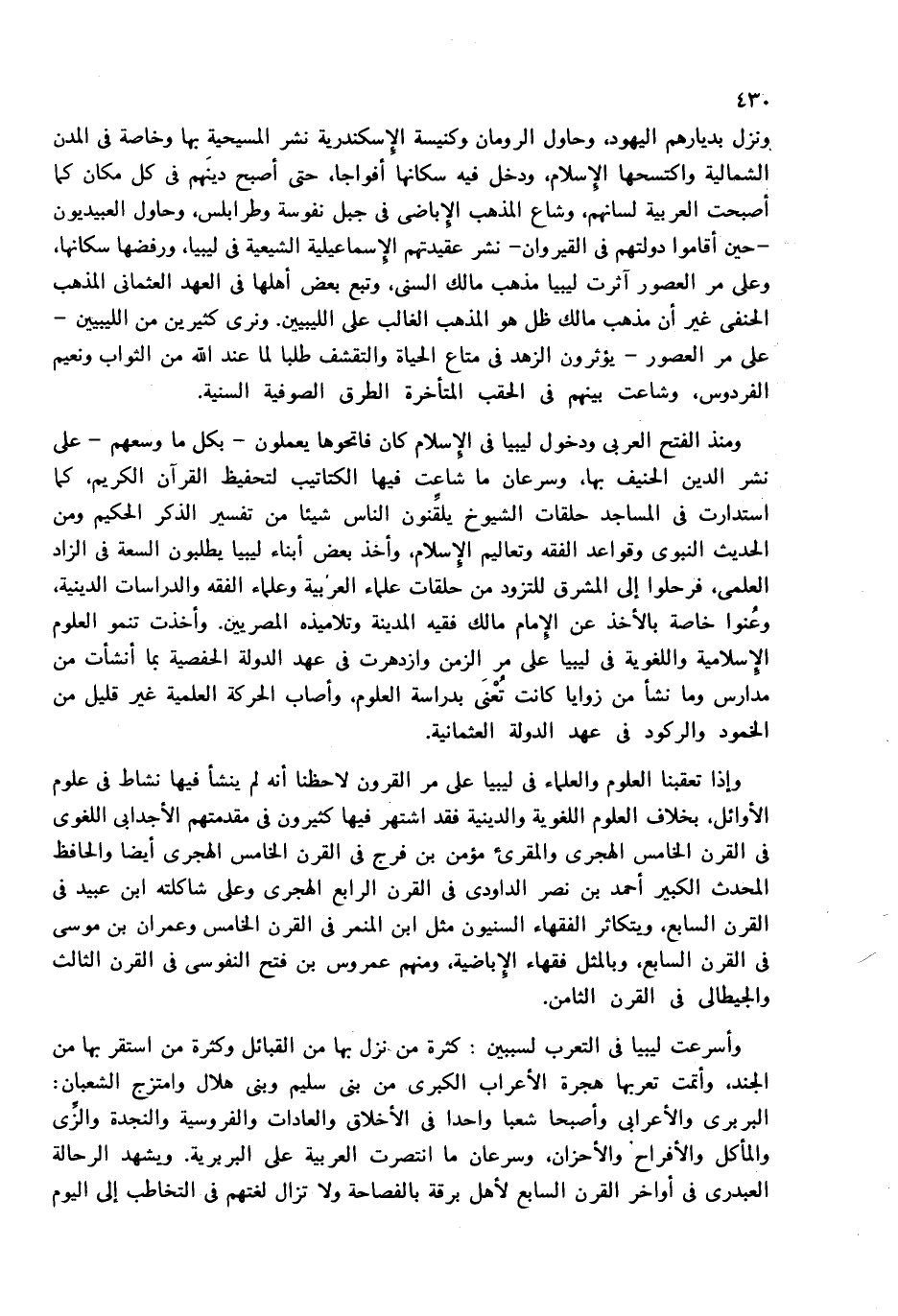ونزل بديارهم اليهود، وحاول الرومان وكنيسة الإسكندرية نشر المسيحية بها وخاصة فى المدن الشمالية واكتسحها الإسلام، ودخل فيه سكانها أفواجا، حتى أصبح دينهم فى كل مكان كما أصبحت العربية لسانهم، وشاع المذهب الإباضى فى جبل نفوسة وطرابلس، وحاول العبيديون -حين أقاموا دولتهم فى القيروان-نشر عقيدتهم الإسماعيلية الشيعية فى ليبيا، ورفضها سكانها، وعلى مر العصور آثرت ليبيا مذهب مالك السنى، وتبع بعض أهلها فى العهد العثمانى المذهب الحنفى غير أن مذهب مالك ظل هو المذهب الغالب على الليبيين. ونرى كثيرين من الليبيين- على مر العصور-يؤثرون الزهد فى متاع الحياة والتقشف طلبا لما عند الله من الثواب ونعيم الفردوس، وشاعت بينهم فى الحقب المتأخرة الطرق الصوفية السنية.