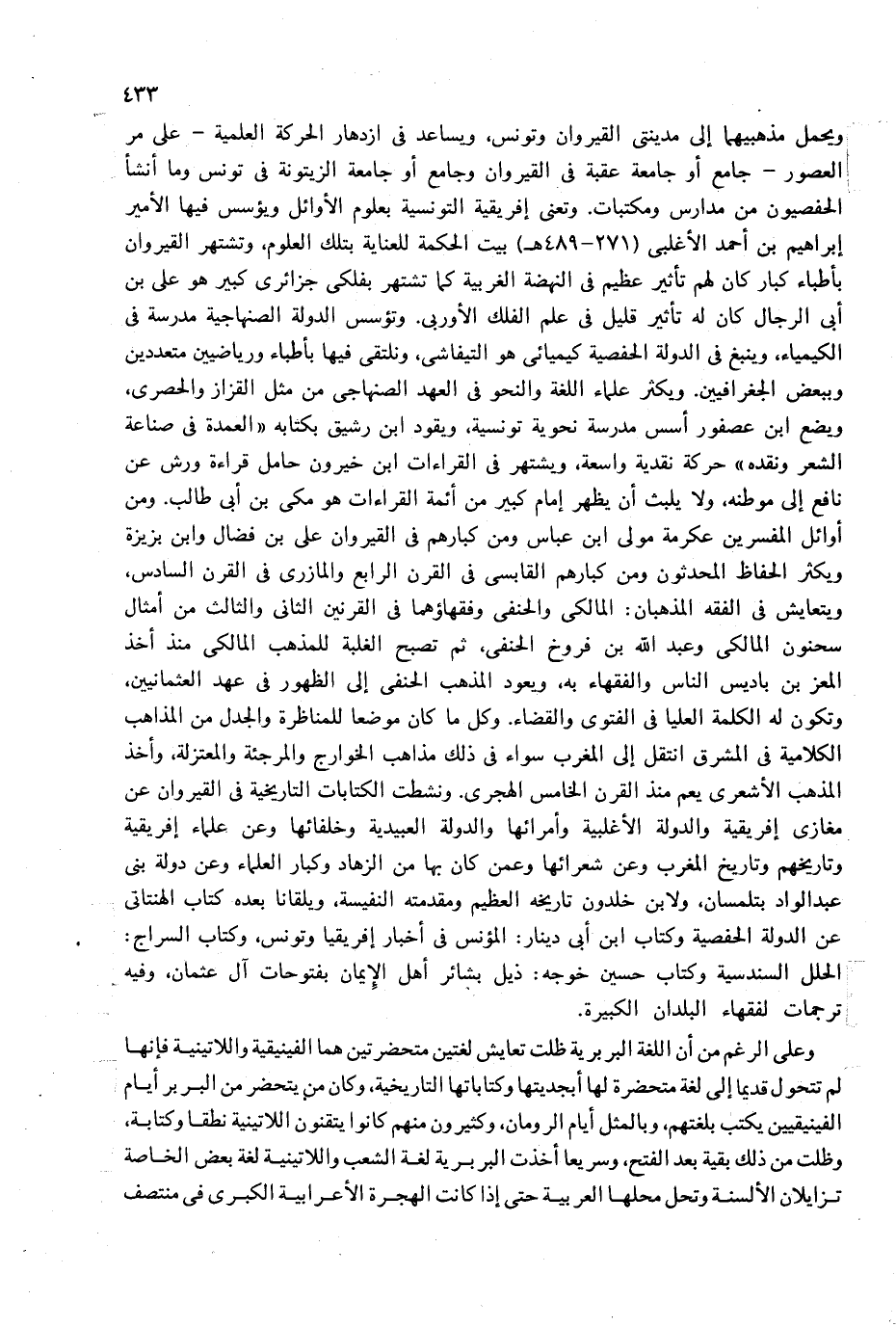 ويحمل مذهبيهما إلى مدينتى القيروان وتونس، ويساعد فى ازدهار الحركة العلمية-على مر العصور-جامع أو جامعة عقبة فى القيروان وجامع أو جامعة الزيتونة فى تونس وما أنشأ الحفصيون من مدارس ومكتبات. وتعنى إفريقية التونسية بعلوم الأوائل ويؤسس فيها الأمير إبراهيم بن أحمد الأغلبى (271 - 489 هـ) بيت الحكمة للعناية بتلك العلوم، وتشتهر القيروان بأطباء كبار كان لهم تأثير عظيم فى النهضة الغربية كما تشتهر بفلكى جزائرى كبير هو على بن أبى الرجال كان له تأثير قليل فى علم الفلك الأوربى. وتؤسس الدولة الصنهاجية مدرسة فى الكيمياء، وينبغ فى الدولة الحفصية كيميائى هو التيفاشى، ونلتقى فيها بأطباء ورياضيين متعددين وببعض الجغرافيين. ويكثر علماء اللغة والنحو فى العهد الصنهاجى من مثل القزاز والحصرى، ويضع ابن عصفور أسس مدرسة نحوية تونسية، ويقود ابن رشيق بكتابه «العمدة فى صناعة الشعر ونقده» حركة نقدية واسعة، ويشتهر فى القراءات ابن خيرون حامل قراءة ورش عن نافع إلى موطنه، ولا يلبث أن يظهر إمام كبير من أئمة القراءات هو مكى بن أبى طالب. ومن أوائل المفسرين عكرمة مولى ابن عباس ومن كبارهم فى القيروان على بن فضال وابن بزيزة ويكثر الحفاظ المحدثون ومن كبارهم القابسى فى القرن الرابع والمازرى فى القرن السادس، ويتعايش فى الفقه المذهبان: المالكى والحنفى وفقهاؤهما فى القرنين الثانى والثالث من أمثال سحنون المالكى وعبد الله بن فروخ الحنفى، ثم تصبح الغلبة للمذهب المالكى منذ أخذ المعز بن باديس الناس والفقهاء به، ويعود المذهب الحنفى إلى الظهور فى عهد العثمانيين، وتكون له الكلمة العليا فى الفتوى والقضاء. وكل ما كان موضعا للمناظرة والجدل من المذاهب الكلامية فى المشرق انتقل إلى المغرب سواء فى ذلك مذاهب الخوارج والمرجئة والمعتزلة، وأخذ المذهب الأشعرى يعم منذ القرن الخامس الهجرى. ونشطت الكتابات التاريخية فى القيروان عن مغازى إفريقية والدولة الأغلبية وأمرائها والدولة العبيدية وخلفائها وعن علماء إفريقية وتاريخهم وتاريخ المغرب وعن شعرائها وعمن كان بها من الزهاد وكبار العلماء وعن دولة بنى عبد الواد بتلمسان، ولابن خلدون تاريخه العظيم ومقدمته النفيسة، ويلقانا بعده كتاب الهنتاتى عن الدولة الحفصية وكتاب ابن أبى دينار: المؤنس فى أخبار إفريقيا وتونس، وكتاب السراج:
