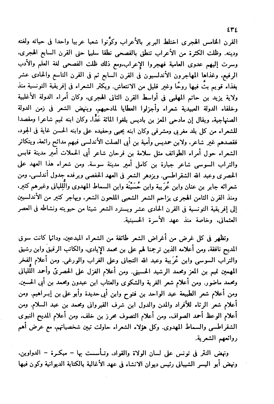 القرن الخامس الهجرى اختلط البربر بالأعراب وكوّنوا شعبا عربيا واحدا فى حياته ولغته ودينه. وظلت الكثرة من الأعراب تنطق بالفصحى نطقا سليما حتى القرن السابع الهجرى، وسرت إليهم عدوى العامية فهجروا الإعراب، ومع ذلك ظلت الفصحى لغة العلم والأدب الرفيع، وغذاها المهاجرون الأندلسيون فى القرن السابع ثم فى القرن التاسع والحادى عشر بغذاء قويم بثّ فيها روحا وغير قليل من الانتعاش. ويكثر الشعراء فى إفريقية التونسية منذ ولاية يزيد بن حاتم المهلبى فى أواسط القرن الثانى الهجرى، وكان أمراء الدولة الأغلبية وخلفاء الدولة العبيدية شعراء وأجزلوا العطايا لمادحيهم، وينهض الشعر فى زمن الدولة الصنهاجية، ويقال إن مادحى المعز بن باديس بلغوا المائة عدّا، وكان ابنه تميم شاعرا ومقصدا للشعراء من كل بلد مغربى ومشرقى وكان ابنه يحيى وحفيده على وابنه الحسن غاية فى الجود، فقصدهم غير شاعر، ولابن حمديس وأمية بن أبى الصلت الأندلسى فيهم مدائح رائعة، ويتكاثر الشعراء حول أمراء الطوائف مثل سلامة بن فرحان شاعر أبى الحملات أمير مدينة قابس والتراب السوسى شاعر جبارة بن كامل أمير مدينة سوسة. ومن شعراء هذا العهد على الحصرى وعبد الله الشقراطسى. ويزدهر الشعر فى العهد الحفصى ويرفده جدول أندلسى، ومن شعرائه جابر بن عنان وابن عريبة وابن حسينة وابن السماط المهدوى والليانى وغيرهم كثير، ومنذ القرن الثامن الهجرى يزاحم الشعر الشعبى الملحون الشعر، ويهاجر كثير من الأندلسيين إلى إفريقية التونسية فى القرن الحادى عشر ويسترد الشعر شيئا من حيويته ونشاطه فى العصر العثمانى، وخاصة منذ عهد الأسرة الحسينية.