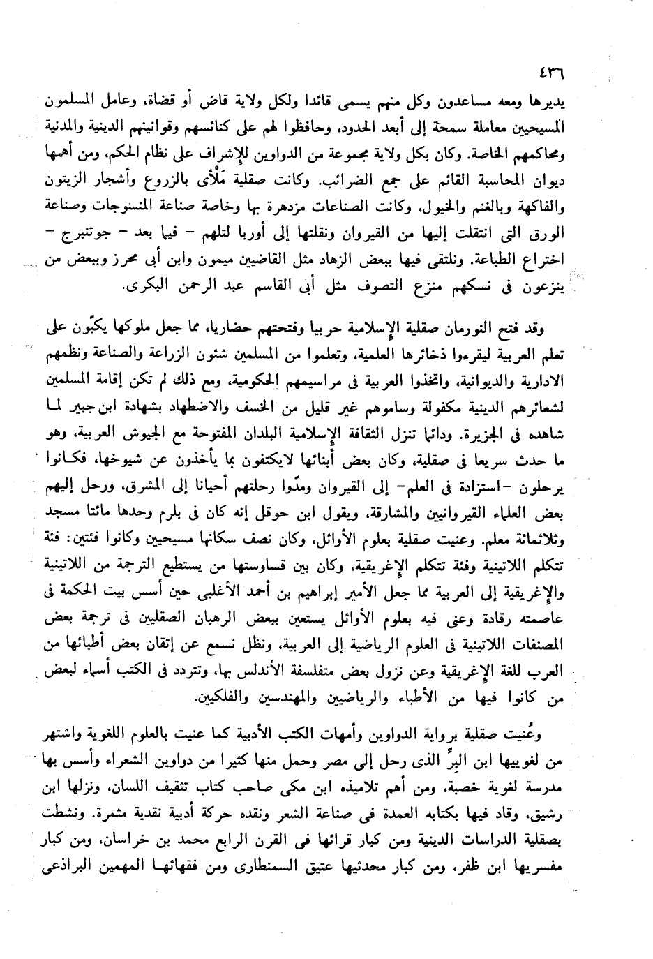 وقد فتح النورمان صقلية الإسلامية حربيا وفتحتهم حضاريا، مما جعل ملوكها يكبّون على تعلم العربية ليقرءوا ذخائرها العلمية، وتعلموا من المسلمين شئون الزراعة والصناعة ونظمهم الادارية والديوانية، واتخذوا العربية فى مراسيمهم الحكومية، ومع ذلك لم تكن إقامة المسلمين لشعائرهم الدينية مكفولة وساموهم غير قليل من الخسف والاضطهاد بشهادة ابن جبير لما شاهده فى الجزيرة. ودائما تنزل الثقافة الإسلامية البلدان المفتوحة مع الجيوش العربية، وهو ما حدث سريعا فى صقلية، وكان بعض أبنائها لا يكتفون بما يأخذون عن شيوخها، فكانوا يرحلون-استزادة فى العلم-إلى القيروان ومدّوا رحلتهم أحيانا إلى المشرق، ورحل إليهم بعض العلماء القيروانيين والمشارقة، ويقول ابن حوقل إنه كان فى بلرم وحدها مائتا مسجد وثلاثمائة معلم. وعنيت صقلية بعلوم الأوائل، وكان نصف سكانها مسيحيين وكانوا فئتين: فئة تتكلم اللاتينية وفئة تتكلم الإغريقية، وكان بين قساوستها من يستطيع الترجمة من اللاتينية والإغريقية إلى العربية مما جعل الأمير إبراهيم بن أحمد الأغلبى حين أسس بيت الحكمة فى عاصمته رقادة وعنى فيه بعلوم الأوائل يستعين ببعض الرهبان الصقليين فى ترجمة بعض المصنفات اللاتينية فى العلوم الرياضية إلى العربية، ونظل نسمع عن إتقان بعض أطبائها من العرب للغة الإغريقية وعن نزول بعض متفلسفة الأندلس بها، وتتردد فى الكتب أسماء لبعض من كانوا فيها من الأطباء والرياضيين والمهندسين والفلكيين.