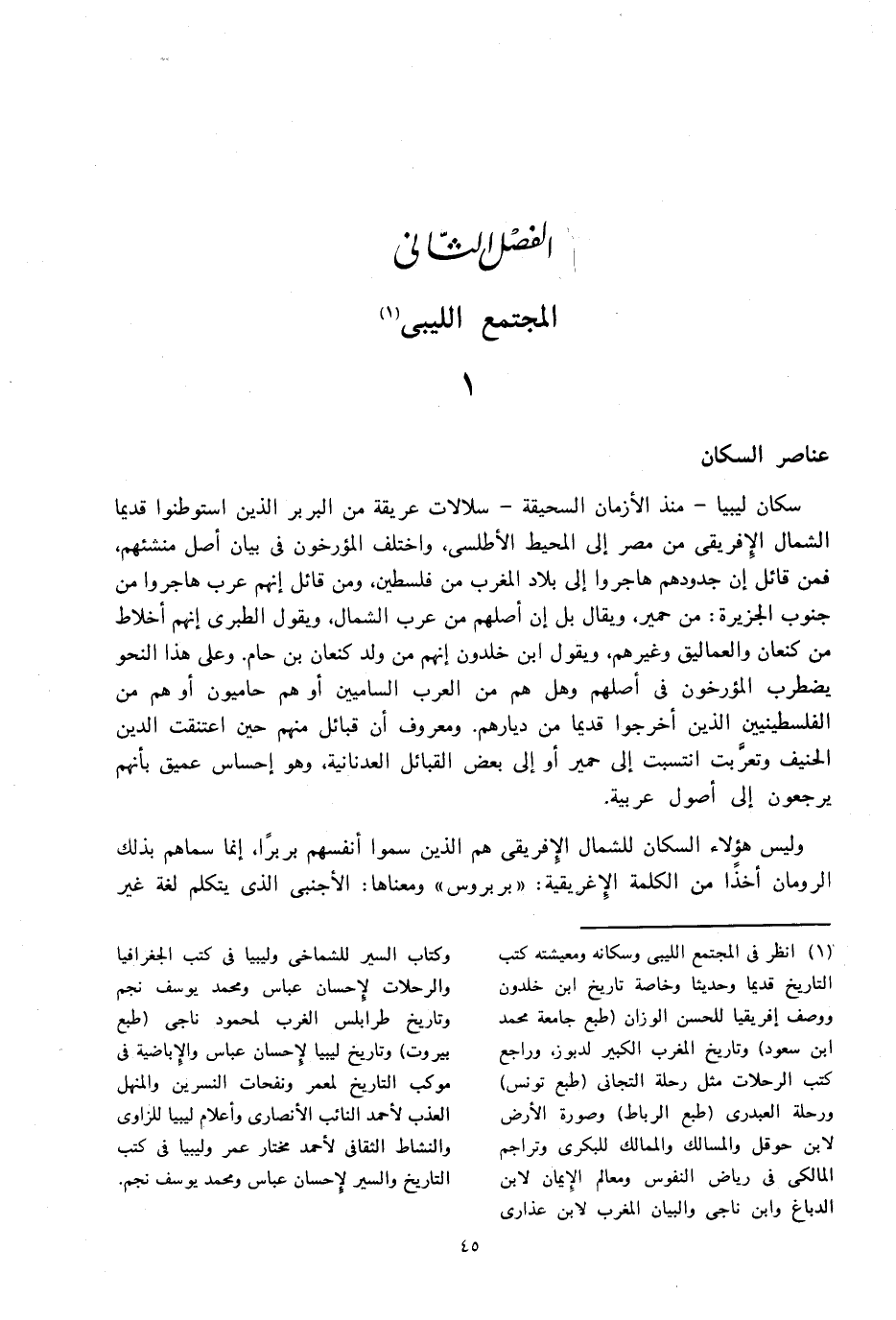(¬1) انظر فى المجتمع الليبى وسكانه ومعيشته كتب التاريخ قديما وحديثا وخاصة تاريخ ابن خلدون ووصف إفريقيا للحسن الوزان (طبع جامعة محمد ابن سعود) وتاريخ المغرب الكبير لدبوز، وراجع كتب الرحلات مثل رحلة التجانى (طبع تونس) ورحلة العبدرى (طبع الرباط) وصورة الأرض لابن حوقل والمسالك والممالك للبكرى وتراجم المالكى فى رياض النفوس ومعالم الإيمان لابن الدباغ وابن ناجى والبيان المغرب لابن عذارى وكتاب السير للشماخى وليبيا فى كتب الجغرافيا والرحلات لإحسان عباس ومحمد يوسف نجم وتاريخ طرابلس الغرب لمحمود ناجى (طبع بيروت) وتاريخ ليبيا لإحسان عباس والإباضية فى موكب التاريخ لمعمر ونفحات النسرين والمنهل العذب لأحمد النائب الأنصارى وأعلام ليبيا للزاوى والنشاط الثقافى لأحمد مختار عمر وليبيا فى كتب التاريخ والسير لإحسان عباس ومحمد يوسف نجم.