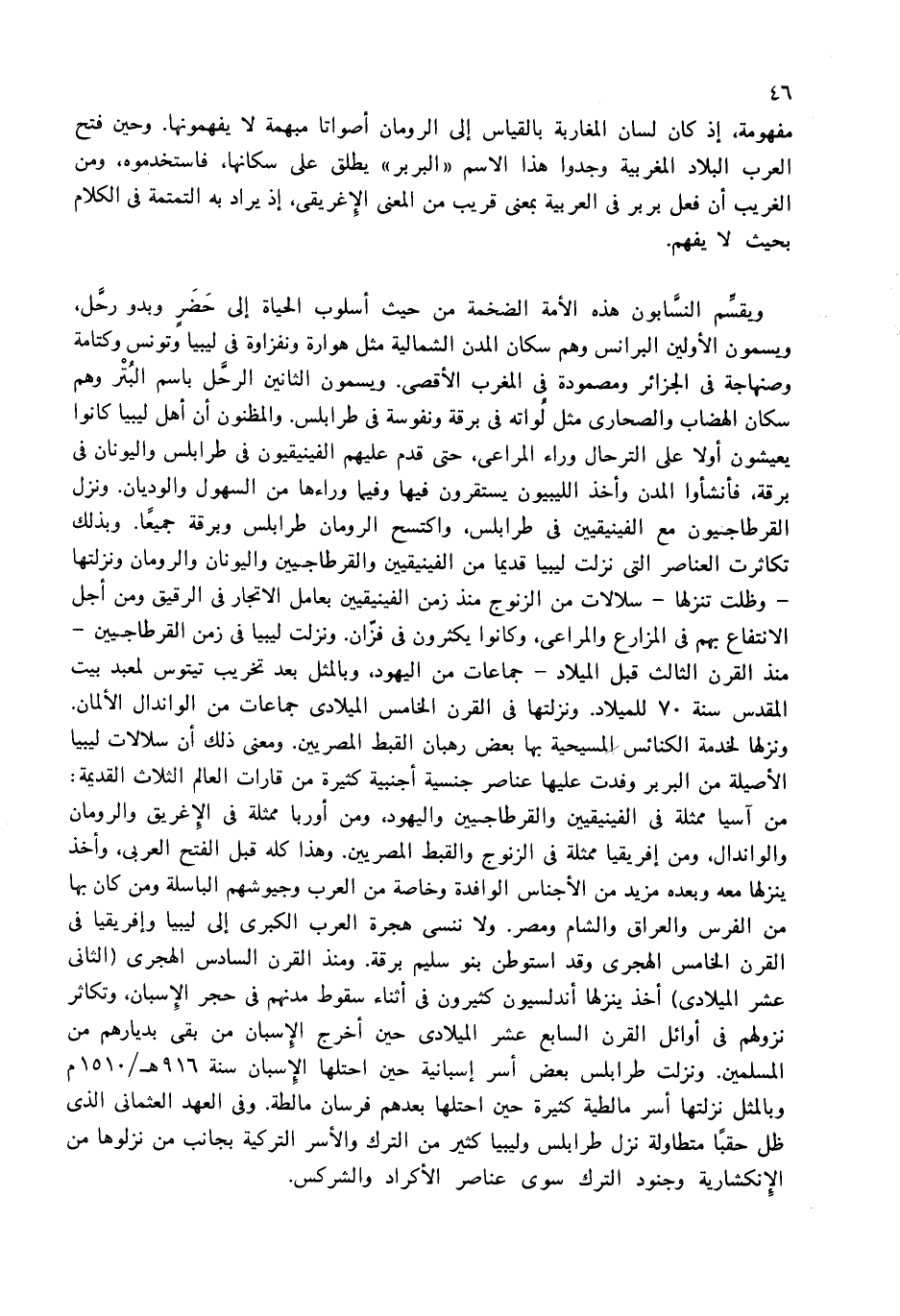 من آسيا ممثلة فى الفينيقيين والقرطاجيين واليهود، ومن أوربا ممثلة فى الإغريق والرومان والواندال، ومن إفريقيا ممثلة فى الزنوج والقبط المصريين. وهذا كله قبل الفتح العربى، وأخذ ينزلها معه وبعده مزيد من الأجناس الوافدة وخاصة من العرب وجيوشهم الباسلة ومن كان بها من الفرس والعراق والشام ومصر. ولا ننسى هجرة العرب الكبرى إلى ليبيا وإفريقيا فى القرن الخامس الهجرى وقد استوطن بنو سليم برقة. ومنذ القرن السادس الهجرى (الثانى عشر الميلادى) أخذ ينزلها أندلسيون كثيرون فى أثناء سقوط مدنهم فى حجر الإسبان، وتكاثر نزولهم فى أوائل القرن السابع عشر الميلادى حين أخرج الإسبان من بقى بديارهم من المسلمين. ونزلت طرابلس بعض أسر إسبانية حين احتلها الإسبان سنة 916 هـ/1510 م وبالمثل نزلتها أسر مالطية كثيرة حين احتلها بعدهم فرسان مالطة. وفى العهد العثمانى الذى ظل حقبا متطاولة نزل طرابلس وليبيا كثير من الترك والأسر التركية بجانب من نزلوها من الانكشارية وجنود الترك سوى عناصر الأكراد والشركس.