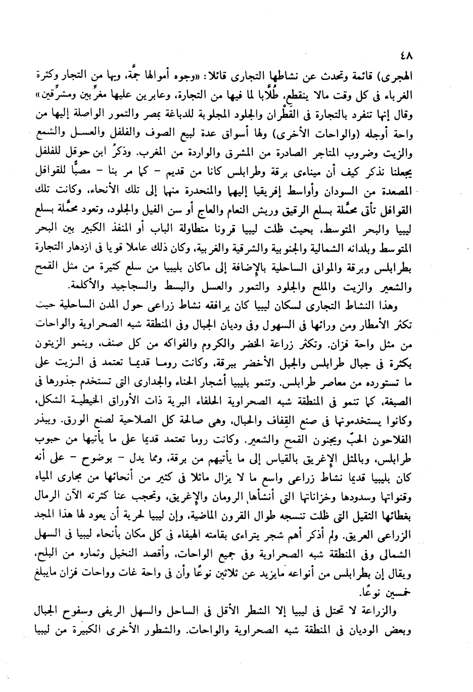الهجرى) قائمة وتحدث عن نشاطها التجارى قائلا: «وجوه أموالها جمّة، وبها من التجار وكثرة الغرباء فى كل وقت مالا ينقطع، طلاّبا لما فيها من التجارة، وعابرين عليها مغرّبين ومشرّقين» وقال إنها تنفرد بالتجارة فى القطران والجلود المجلوبة للدباغة بمصر والتمور الواصلة إليها من واحة أوجله (والواحات الأخرى) ولها أسواق عدة لبيع الصوف والفلفل والعسل والشمع والزيت وضروب المتاجر الصادرة من المشرق والواردة من المغرب. وذكر ابن حوقل للفلفل يجعلنا نذكر كيف أن ميناءى برقة وطرابلس كانا من قديم-كما مر بنا-مصبّا للقوافل المصعدة من السودان وأواسط إفريقيا إليهما والمنحدرة منهما إلى تلك الأنحاء، وكانت تلك القوافل تأتى محمّلة بسلع الرقيق وريش النعام والعاج أو سن الفيل والجلود، وتعود محمّلة بسلع ليبيا والبحر المتوسط، بحيث ظلت ليبيا قرونا متطاولة الباب أو المنفذ الكبير بين البحر المتوسط وبلدانه الشمالية والجنوبية والشرقية والغربية، وكان ذلك عاملا قويا فى ازدهار التجارة بطرابلس وبرقة والموانى الساحلية بالإضافة إلى ما كان بليبيا من سلع كثيرة من مثل القمح والشعير والزيت والملح والجلود والتمور والعسل والبسط والسجاجيد والأكلمة.