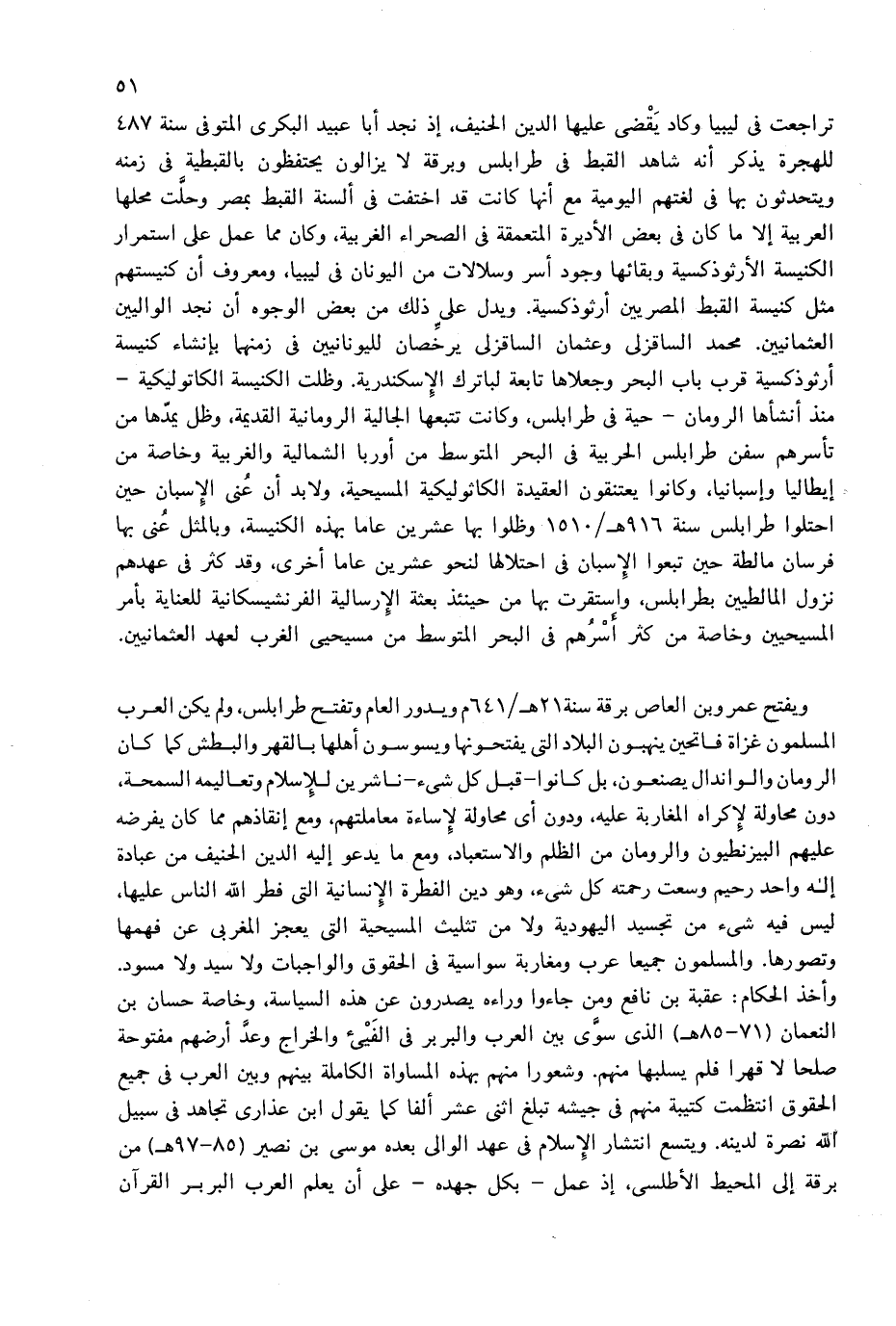 ويفتح عمرو بن العاص برقة سنة 21 هـ/641 م ويدور العام وتفتح طرابلس، ولم يكن العرب المسلمون غزاة فاتحين ينهبون البلاد التى يفتحونها ويسوسون أهلها بالقهر والبطش كما كان الرومان والواندال يصنعون، بل كانوا-قبل كل شئ-ناشرين للإسلام وتعاليمه السمحة، دون محاولة لإكراه المغاربة عليه، ودون أى محاولة لإساءة معاملتهم، ومع إنقاذهم مما كان يفرضه عليهم البيزنطيون والرومان من الظلم والاستعباد، ومع ما يدعو إليه الدين الحنيف من عبادة إله واحد رحيم وسعت رحمته كل شئ، وهو دين الفطرة الإنسانية التى فطر الله الناس عليها، ليس فيه شئ من تجسيد اليهودية ولا من تثليث المسيحية التى يعجز المغربى عن فهمها وتصورها. والمسلمون جميعا عرب ومغاربة سواسية فى الحقوق والواجبات ولا سيد ولا مسود.