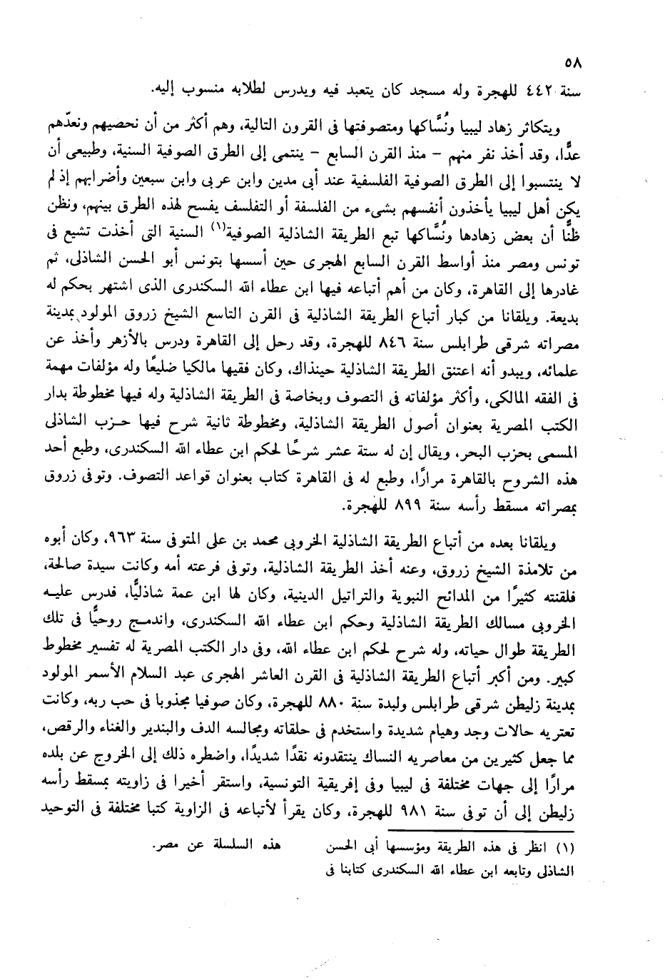 (¬1) انظر فى هذه الطريقة ومؤسسها أبى الحسن الشاذلى وتابعه ابن عطاء الله السكندرى كتابنا فى هذه السلسلة عن مصر.