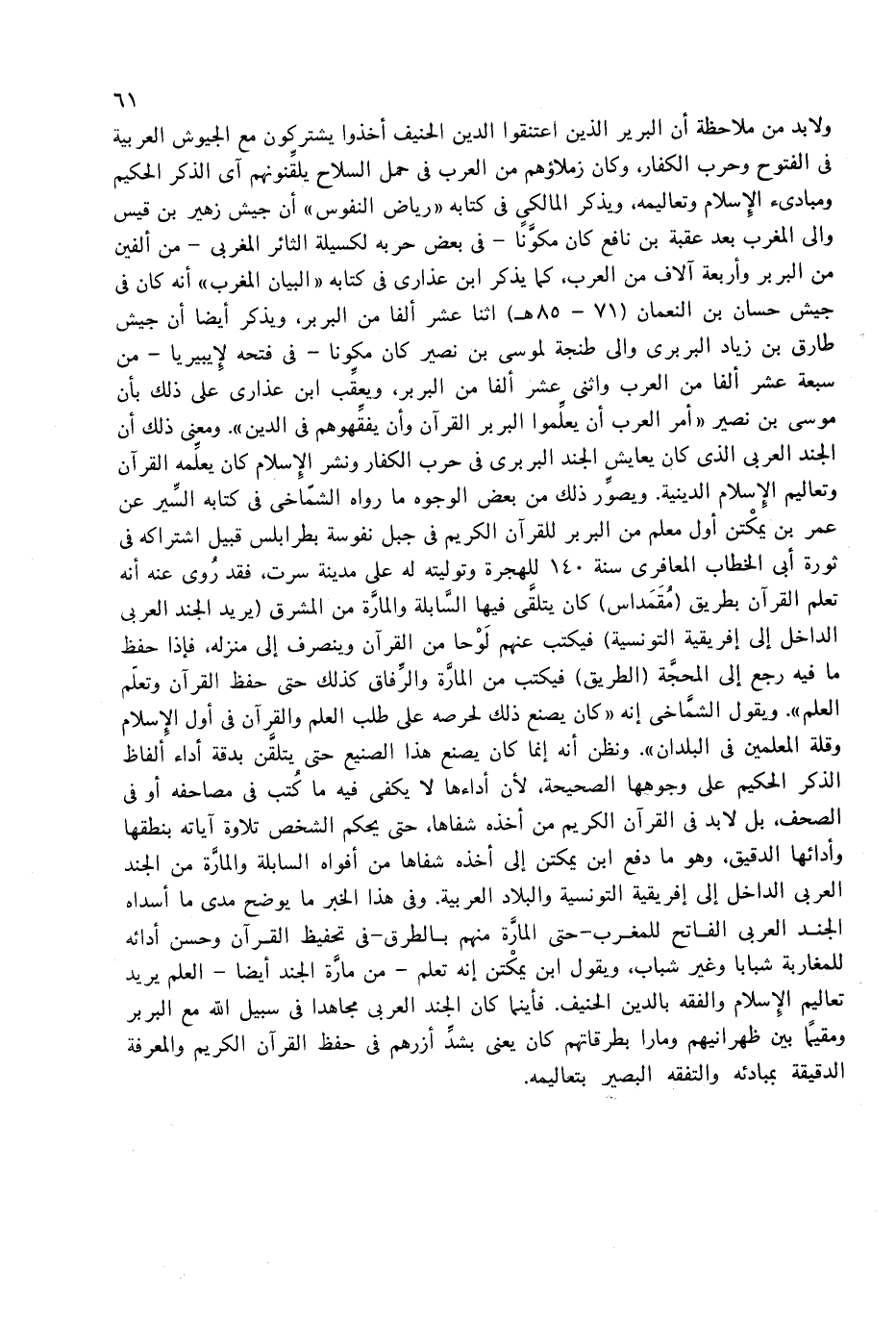 ولا بد من ملاحظة أن البربر الذين اعتنقوا الدين الحنيف أخذوا يشتركون مع الجيوش العربية فى الفتوح وحرب الكفار، وكان زملاؤهم من العرب فى حمل السلاح يلقّنونهم آى الذكر الحكيم ومبادئ الإسلام وتعاليمه، ويذكر المالكى فى كتابه «رياض النفوس» أن جيش زهير بن قيس والى المغرب بعد عقبة بن نافع كان مكوّنا-فى بعض حربه لكسيلة الثائر المغربى-من ألفين من البربر وأربعة آلاف من العرب، كما يذكر ابن عذارى فى كتابه «البيان المغرب» أنه كان فى جيش حسان بن النعمان (71 - 85 هـ) اثنا عشر ألفا من البربر، ويذكر أيضا أن جيش طارق بن زياد البربرى والى طنجة لموسى بن نصير كان مكونا-فى فتحه لإيبيريا-من سبعة عشر ألفا من العرب واثنى عشر ألفا من البربر، ويعقّب ابن عذارى على ذلك بأن موسى بن نصير «أمر العرب أن يعلّموا البربر القرآن وأن يفقّهوهم فى الدين». ومعنى ذلك أن الجند العربى الذى كان يعايش الجند البربرى فى حرب الكفار ونشر الإسلام كان يعلّمه القرآن وتعاليم الإسلام الدينية. ويصوّر ذلك من بعض الوجوه ما رواه الشمّاخى فى كتابه السّير عن عمر بن يمكتن أول معلم من البربر للقرآن الكريم فى جبل نفوسة بطرابلس قبيل اشتراكه فى ثورة أبى الخطاب المعافرى سنة 140 للهجرة وتوليته له على مدينة سرت، فقد روى عنه أنه تعلم القرآن بطريق (مقمداس) كان يتلقّى فيها السّابلة والمارّة من المشرق (يريد الجند العربى الداخل إلى إفريقية التونسية) فيكتب عنهم لوحا من القرآن وينصرف إلى منزله، فإذا حفظ ما فيه رجع إلى المحجّة (الطريق) فيكتب من المارّة والرّفاق كذلك حتى حفظ القرآن وتعلّم العلم». ويقول الشمّاخى إنه «كان يصنع ذلك لحرصه على طلب العلم والقرآن فى أول الإسلام وقلة المعلمين فى البلدان». ونظن أنه إنما كان يصنع هذا الصنيع حتى يتلقّن بدقة أداء ألفاظ الذكر الحكيم على وجوهها الصحيحة، لأن أداءها لا يكفى فيه ما كتب فى مصاحفه أو فى الصحف، بل لا بد فى القرآن الكريم من أخذه شفاها، حتى يحكم الشخص تلاوة آياته بنطقها وأدائها الدقيق، وهو ما دفع ابن يمكتن إلى أخذه شفاها من أفواه السابلة والمارّة من الجند العربى الداخل إلى إفريقية التونسية والبلاد العربية. وفى هذا الخبر ما يوضح مدى ما أسداه الجند العربى الفاتح للمغرب-حتى المارّة منهم بالطرق-فى تحفيظ القرآن وحسن أدائه للمغاربة شبابا وغير شباب، ويقول ابن يمكتن إنه تعلم-من مارّة الجند أيضا-العلم يريد تعاليم الإسلام والفقه بالدين الحنيف. فأينما كان الجند العربى مجاهدا فى سبيل الله مع البربر ومقيما بين ظهرانيهم ومارا بطرقاتهم كان يعنى بشدّ أزرهم فى حفظ القرآن الكريم والمعرفة الدقيقة بمبادئه والتفقه البصير بتعاليمه.