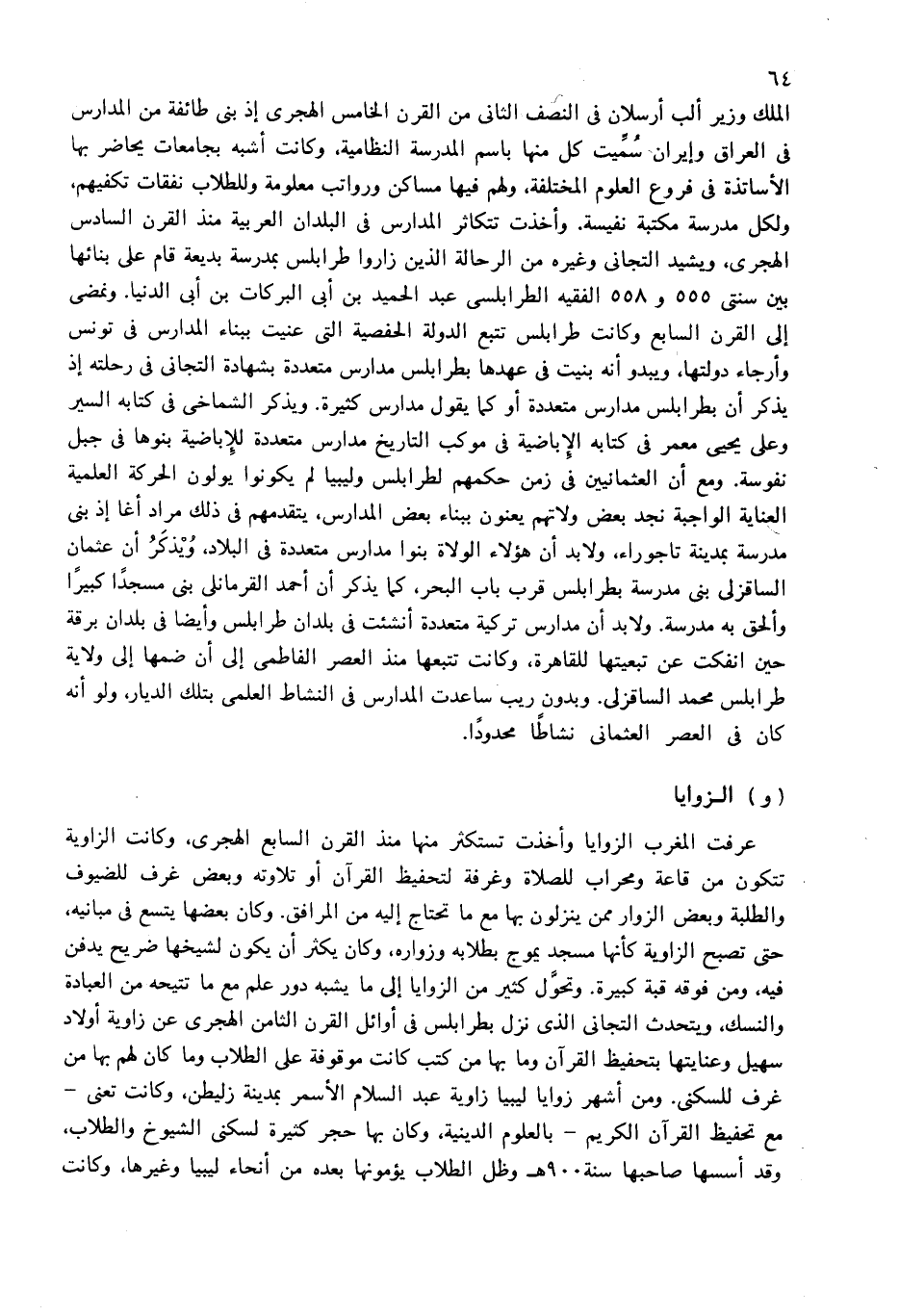 الملك وزير ألب أرسلان فى النصف الثانى من القرن الخامس الهجرى إذ بنى طائفة من المدارس فى العراق وإيران سمّيت كل منها باسم المدرسة النظامية، وكانت أشبه بجامعات يحاضر بها الأساتذة فى فروع العلوم المختلفة، ولهم فيها مساكن ورواتب معلومة وللطلاب نفقات تكفيهم، ولكل مدرسة مكتبة نفيسة. وأخذت تتكاثر المدارس فى البلدان العربية منذ القرن السادس الهجرى، ويشيد التجانى وغيره من الرحالة الذين زاروا طرابلس بمدرسة بديعة قام على بنائها بين سنتى 555 و 558 الفقيه الطرابلسى عبد الحميد بن أبى البركات بن أبى الدنيا. ونمضى إلى القرن السابع وكانت طرابلس تتبع الدولة الحفصية التى عنيت ببناء المدارس فى تونس وأرجاء دولتها، ويبدو أنه بنيت فى عهدها بطرابلس مدارس متعددة بشهادة التجانى فى رحلته إذ يذكر أن بطرابلس مدارس متعددة أو كما يقول مدارس كثيرة. ويذكر الشماخى فى كتابه السير وعلى يحيى معمر فى كتابه الإباضية فى موكب التاريخ مدارس متعددة للإباضية بنوها فى جبل نفوسة. ومع أن العثمانيين فى زمن حكمهم لطرابلس وليبيا لم يكونوا يولون الحركة العلمية العناية الواجبة نجد بعض ولاتهم يعنون ببناء بعض المدارس، يتقدمهم فى ذلك مراد أغا إذ بنى مدرسة بمدينة تاجوراء، ولا بد أن هؤلاء الولاة بنوا مدارس متعددة فى البلاد، ويذكر أن عثمان الساقزلى بنى مدرسة بطرابلس قرب باب البحر، كما يذكر أن أحمد القرمانلى بنى مسجدا كبيرا وألحق به مدرسة. ولا بد أن مدارس تركية متعددة أنشئت فى بلدان طرابلس وأيضا فى بلدان برقة حين انفكت عن تبعيتها للقاهرة، وكانت تتبعها منذ العصر الفاطمى إلى أن ضمها إلى ولاية طرابلس محمد الساقزلى. وبدون ريب ساعدت المدارس فى النشاط العلمى بتلك الديار، ولو أنه كان فى العصر العثمانى نشاطا محدودا.