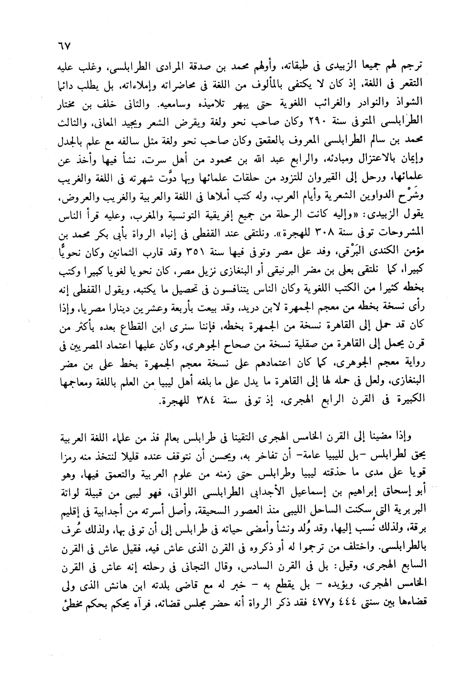 ترجم لهم جميعا الزبيدى فى طبقاته، وأولهم محمد بن صدقة المرادى الطرابلسى، وغلب عليه التقعر فى اللغة، إذ كان لا يكتفى بالمألوف من اللغة فى محاضراته وإملاءاته، بل يطلب دائما الشواذ والنوادر والغرائب اللغوية حتى يبهر تلاميذه وسامعيه. والثانى خلف بن مختار الطرابلسى المتوفى سنة 290 وكان صاحب نحو ولغة ويقرض الشعر ويجيد المعانى، والثالث محمد بن سالم الطرابلسى المعروف بالعقعق وكان صاحب نحو ولغة مثل سالفه مع علم بالجدل وإيمان بالاعتزال ومبادئه، والرابع عبد الله بن محمود من أهل سرت، نشأ فيها وأخذ عن علمائها، ورحل إلى القيروان للتزود من حلقات علمائها وبها دوّت شهرته فى اللغة والغريب وشرح الدواوين الشعرية وأيام العرب، وله كتب أملاها فى اللغة والعربية والغريب والعروض، يقول الزبيدى: «وإليه كانت الرحلة من جميع إفريقية التونسية والمغرب، وعليه قرأ الناس المشروحات توفى سنة 308 للهجرة». ونلتقى عند القفطى فى إنباه الرواة بأبى بكر محمد بن مؤمن الكندى البرقى، وفد على مصر وتوفى فيها سنة 351 وقد قارب الثمانين وكان نحويّا كبيرا، كما نلتقى بعلى بن مضر البرنيقى أو البنغازى نزيل مصر، كان نحويا لغويا كبيرا وكتب بخطه كثيرا من الكتب اللغوية وكان الناس يتنافسون فى تحصيل ما يكتبه، ويقول القفطى إنه رأى نسخة بخطه من معجم الجمهرة لابن دريد، وقد بيعت بأربعة وعشرين دينارا مصريا، وإذا كان قد حمل إلى القاهرة نسخة من الجمهرة بخطه، فإننا سنرى ابن القطاع بعده بأكثر من قرن يحمل إلى القاهرة من صقلية نسخة من صحاح الجوهرى، وكان عليها اعتماد المصريين فى رواية معجم الجوهرى، كما كان اعتمادهم على نسخة معجم الجمهرة بخط على بن مضر البنغازى، ولعل فى حمله لها إلى القاهرة ما يدل على ما بلغه أهل ليبيا من العلم باللغة ومعاجمها الكبيرة فى القرن الرابع الهجرى، إذ توفى سنة 384 للهجرة.