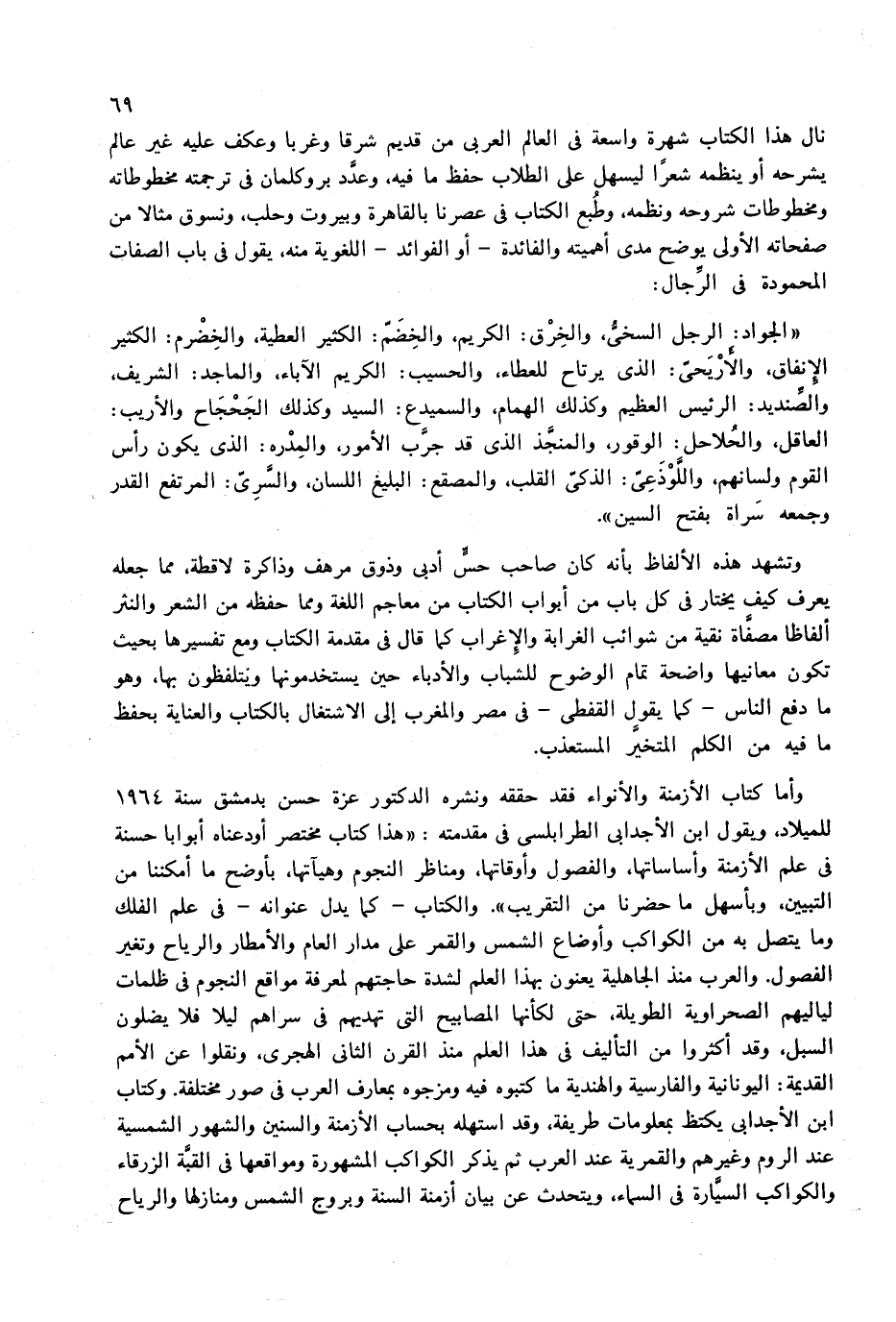 وأما كتاب الأزمنة والأنواء فقد حققه ونشره الدكتور عزة حسن بدمشق سنة 1964 للميلاد، ويقول ابن الأجدابي الطرابلسى فى مقدمته: «هذا كتاب مختصر أودعناه أبوابا حسنة فى علم الأزمنة وأساساتها، والفصول وأوقاتها، ومناظر النجوم وهيآتها، بأوضح ما أمكننا من التبيين، وبأسهل ما حضرنا من التقريب». والكتاب-كما يدل عنوانه-فى علم الفلك وما يتصل به من الكواكب وأوضاع الشمس والقمر على مدار العام والأمطار والرياح وتغير الفصول. والعرب منذ الجاهلية يعنون بهذا العلم لشدة حاجتهم لمعرفة مواقع النجوم فى ظلمات لياليهم الصحراوية الطويلة، حتى لكأنها المصابيح التى تهديهم فى سراهم ليلا فلا يضلون السبل، وقد أكثروا من التأليف فى هذا العلم منذ القرن الثانى الهجرى، ونقلوا عن الأمم القديمة: اليونانية والفارسية والهندية ما كتبوه فيه ومزجوه بمعارف العرب فى صور مختلفة. وكتاب ابن الأجدابي يكتظ بمعلومات طريفة، وقد استهله بحساب الأزمنة والسنين والشهور الشمسية عند الروم وغيرهم والقمرية عند العرب ثم يذكر الكواكب المشهورة ومواقعها فى القبّة الزرقاء والكواكب السيّارة فى السماء، ويتحدث عن بيان أزمنة السنة وبروج الشمس ومنازلها والرياح