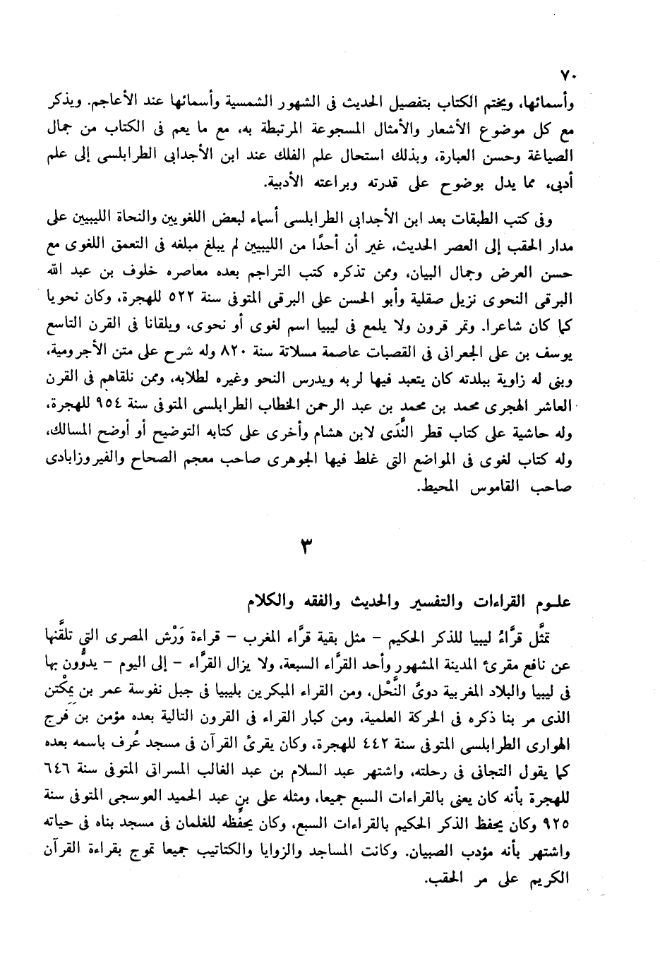 وفى كتب الطبقات بعد ابن الأجدابي الطرابلسى أسماء لبعض اللغويين والنحاة الليبيين على مدار الحقب إلى العصر الحديث، غير أن أحدا من الليبيين لم يبلغ مبلغه فى التعمق اللغوى مع حسن العرض وجمال البيان، وممن تذكره كتب التراجم بعده معاصره خلوف بن عبد الله البرقى النحوى نزيل صقلية وأبو الحسن على البرقى المتوفى سنة 522 للهجرة، وكان نحويا كما كان شاعرا. وتمر قرون ولا يلمع فى ليبيا اسم لغوى أو نحوى، ويلقانا فى القرن التاسع يوسف بن على الجعرانى فى القصبات عاصمة مسلاتة سنة 820 وله شرح على متن الأجرومية، وبنى له زاوية ببلدته كان يتعبد فيها لربه ويدرس النحو وغيره لطلابه، وممن نلقاهم فى القرن العاشر الهجرى محمد بن محمد بن عبد الرحمن الخطاب الطرابلسى المتوفى سنة 954 للهجرة، وله حاشية على كتاب قطر النّدى لابن هشام وأخرى على كتابه التوضيح أو أوضح المسالك، وله كتاب لغوى فى المواضع التى غلط فيها الجوهرى صاحب معجم الصحاح والفيروزآبادي صاحب القاموس المحيط.