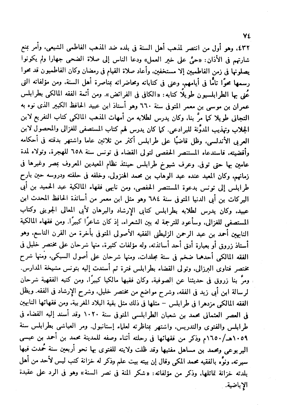 432، وهو أول من انتصر لمذهب أهل السنة فى بلده ضد المذهب الفاطمى الشيعى، وأمر بمنع شارتهم فى الأذان: «حىّ على خير العمل» ودعا الناس إلى صلاة الضحى جهارا ولم يكونوا يصلونها فى زمن الفاطميين إلا مستخفين، وأعاد صلاة القيام فى رمضان وكان الفاطميون قد محوا رسمها محوا تامّا فى أيامهم، وعنى فى كتاباته ومحاضراته بمناصرة أهل السنة، ومن مؤلفاته التى عنى بها الطرابلسيون طويلا كتابه: «الكافى فى الفرائض». ومن أئمة الفقه المالكى بطرابلس عمران بن موسى بن معمر المتوفى سنة 660 وهو أستاذ ابن عبيد الحافظ الكبير الذى نوه به التجانى طويلا كما مرّ بنا، وكان يدرس لطلابه من أمهات المذهب المالكى كتاب التفريع لابن الجلاب وتهذيب المدوّنة للبرادعى. كما كان يدرس لهم كتاب المستصفى للغزالى والمحصول لابن العربى الأندلسى، وظل قاضيا على طرابلس أكثر من ثلاثين عاما واشتهر بدقته فى أحكامه وأقضيته، فاستدعاه المستنصر الحفصى لتولى القضاء فى تونس سنة 658 للهجرة، وتولاه لمدة عامين بها حتى توفى. وعرف شيوخ طرابلس حينئذ نظام المعيدين المعروف بمصر وغيرها فى زمانهم، وكان المعيد عنده عبد الوهاب بن محمد الهنزولى، وخلفه فى حلقته ودروسه حين بارح طرابلس إلى تونس بدعوة المستنصر الحفصى، ومن نابهى فقهاء المالكية عبد الحميد بن أبى البركات بن أبى الدنيا المتوفى سنة 684 وهو مثل ابن معمر من أساتذة الحافظ المحدث ابن عبيد، وكان يدرس لطلابه بطرابلس كتابى الإرشاد والبرهان لأبى المعالى الجوينى وكتاب المستصفى للغزالى، وسأعود للترجمة له بين الشعراء، إذ كان شاعرا كبيرا. ومن فقهاء المالكية النابهين أحمد بن عبد الرحمن الزليطنى الفقيه الأصولى المتوفى بأخرة من القرن التاسع، وهو أستاذ زروق أو بعبارة أدق أحد أساتذته، وله مؤلفات كثيرة، منها شرحان على مختصر خليل فى الفقه المالكى أحدهما ضخم فى ستة مجلدات، ومنها شرحان على أصول السبكى، ومنها شرح مختصر فتاوى البرزالى، وتولى القضاء بطرابلس فترة ثم أسندت إليه بتونس مشيخة المدارس.