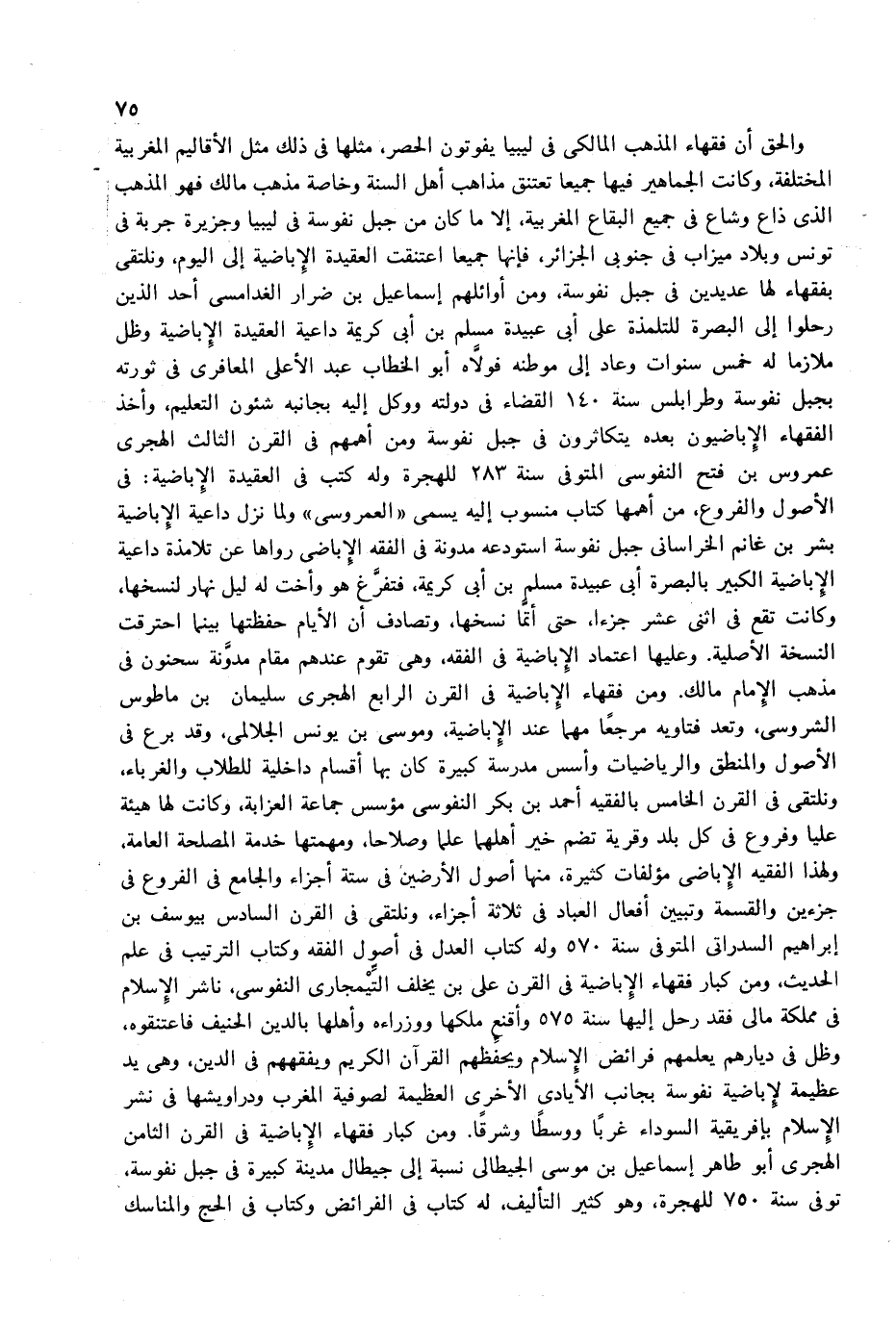والحق أن فقهاء المذهب المالكى فى ليبيا يفوتون الحصر، مثلها فى ذلك مثل الأقاليم المغربية المختلفة، وكانت الجماهير فيها جميعا تعتنق مذاهب أهل السنة وخاصة مذهب مالك فهو المذهب الذى ذاع وشاع فى جميع البقاع المغربية، إلا ما كان من جبل نفوسة فى ليبيا وجزيرة جربة فى تونس وبلاد ميزاب فى جنوبى الجزائر، فإنها جميعا اعتنقت العقيدة الإباضية إلى اليوم، ونلتقى بفقهاء لها عديدين فى جبل نفوسة، ومن أوائلهم إسماعيل بن ضرار الغدامسى أحد الذين رحلوا إلى البصرة للتلمذة على أبى عبيدة مسلم بن أبى كريمة داعية العقيدة الإباضية وظل ملازما له خمس سنوات وعاد إلى موطنه فولاّه أبو الخطاب عبد الأعلى المعافرى فى ثورته بجبل نفوسة وطرابلس سنة 140 القضاء فى دولته ووكل إليه بجانبه شئون التعليم، وأخذ الفقهاء الإباضيون بعده يتكاثرون فى جبل نفوسة ومن أهمهم فى القرن الثالث الهجرى عمروس بن فتح النفوسى المتوفى سنة 283 للهجرة وله كتب فى العقيدة الإباضية: فى الأصول والفروع، من أهمها كتاب منسوب إليه يسمى «العمروسى» ولما نزل داعية الإباضية بشر بن غانم الخراسانى جبل نفوسة استودعه مدونة فى الفقه الإباضى رواها عن تلامذة داعية الإباضية الكبير بالبصرة أبى عبيدة مسلم بن أبى كريمة، فتفرّغ هو وأخت له ليل نهار لنسخها، وكانت تقع فى اثنى عشر جزءا، حتى أتمّا نسخها، وتصادف أن الأيام حفظتها بينما احترقت النسخة الأصلية. وعليها اعتماد الإباضية فى الفقه، وهى تقوم عندهم مقام مدوّنة سحنون فى مذهب الإمام مالك. ومن فقهاء الإباضية فى القرن الرابع الهجرى سليمان بن ماطوس الشروسى، وتعد فتاويه مرجعا مهما عند الإباضية، وموسى بن يونس الجلالمى، وقد برع فى الأصول والمنطق والرياضيات وأسس مدرسة كبيرة كان بها أقسام داخلية للطلاب والغرباء، ونلتقى فى القرن الخامس بالفقيه أحمد بن بكر النفوسى مؤسس جماعة العزابة، وكانت لها هيئة عليا وفروع فى كل بلد وقرية تضم خير أهلهما علما وصلاحا، ومهمتها خدمة المصلحة العامة، ولهذا الفقيه الإباضى مؤلفات كثيرة، منها أصول الأرضين فى ستة أجزاء والجامع فى الفروع فى جزءين والقسمة وتبيين أفعال العباد فى ثلاثة أجزاء، ونلتقى فى القرن السادس بيوسف بن إبراهيم السدراتى المتوفى سنة 570 وله كتاب العدل فى أصول الفقه وكتاب الترتيب فى علم الحديث، ومن كبار فقهاء الإباضية فى القرن على بن يخلف التّيمجارى النفوسى، ناشر الإسلام فى مملكة مالى فقد رحل إليها سنة 575 وأقنع ملكها ووزراءه وأهلها بالدين الحنيف فاعتنقوه، وظل فى ديارهم يعلمهم فرائض الإسلام ويحفّظهم القرآن الكريم ويفقههم فى الدين، وهى يد عظيمة لأباضية نفوسة بجانب الأيادى الأخرى العظيمة لصوفية المغرب ودراويشها فى نشر الإسلام بإفريقية السوداء غربا ووسطا وشرقا. ومن كبار فقهاء الإباضية فى القرن الثامن الهجرى أبو طاهر إسماعيل بن موسى الجيطالى نسبة إلى جيطال مدينة كبيرة فى جبل نفوسة، توفى سنة 750 للهجرة، وهو كثير التأليف، له كتاب فى الفرائض وكتاب فى الحج والمناسك