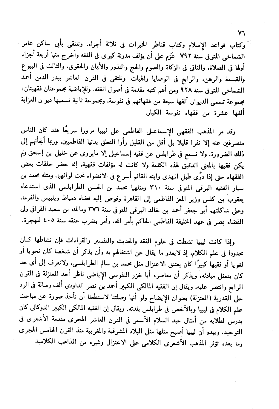 وإذا كانت ليبيا نشطت فى علوم الفقه والحديث والتفسير والقراءات فإن نشاطها كان محدودا فى علم الكلام، إذ لا يعدو ما يقال عن اشتغالهم به وأن يذكر أن شخصا كان نحويا أو لغويا أو فقيها كبيرا كان يعتنق الاعتزال مثل محمد بن سالم الطرابلسى، ولا نعرف إلى أى حد كان يتمثل مبادئه، ويذكر أن معاصره أبا خزر النفوسى الإباضى ناظر أحد المعتزلة فى القرن الرابع وانتصر عليه، ويقال إن الفقيه المالكى الكبير أحمد بن نصر الداودى ألف رسالة فى الرد على القدرية (المعتزلة) بعنوان الإيضاح ولو أنها وصلتنا لاستطعنا أن نأخذ صورة عن مباحث علم الكلام فى ليبيا وبالأخص فى طرابلس بلدته. ويقال إن الفقيه المالكى الكبير الدوكالى كان يدرس لطلابه من أمثال عبد السلام الأسمر فى القرن العاشر الهجرى مقدمة الأشعرى فى التوحيد، ويبدو أن ليبيا أصبح مثلها مثل البلاد المشرقية والمغربية منذ القرن الخامس الهجرى وما بعده تؤثر المذهب الأشعرى الكلامى على الاعتزال وغيره من المذاهب الكلامية.