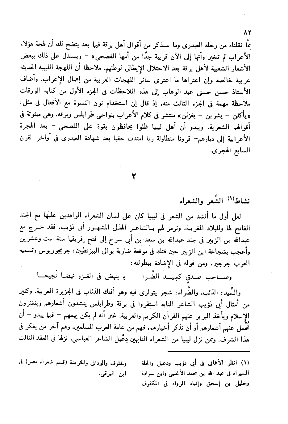 والسّيد: الذئب، والضّراء: شجر يتوارى فيه وهو أفتك الذئاب فى الجزيرة العربية. وكثير من أمثال أبى ذؤيب الشاعر النابه استقروا فى برقة وطرابلس ينشدون أشعارهم وينشرون الإسلام ويأخذ البربر عنهم القرآن الكريم والعربية. غير أنه لم يكن يهمهم-فيما يبدو-أن تحمل عنهم أشعارهم أو أن تذكر أخبارهم، فهم من عامة العرب المسلمين، وهم آخر من يفكر فى هذا الشرف. وممن نزل ليبيا من الشعراء النابهين دعبل الشاعر العباسى، نزلها فى العقد الثالث