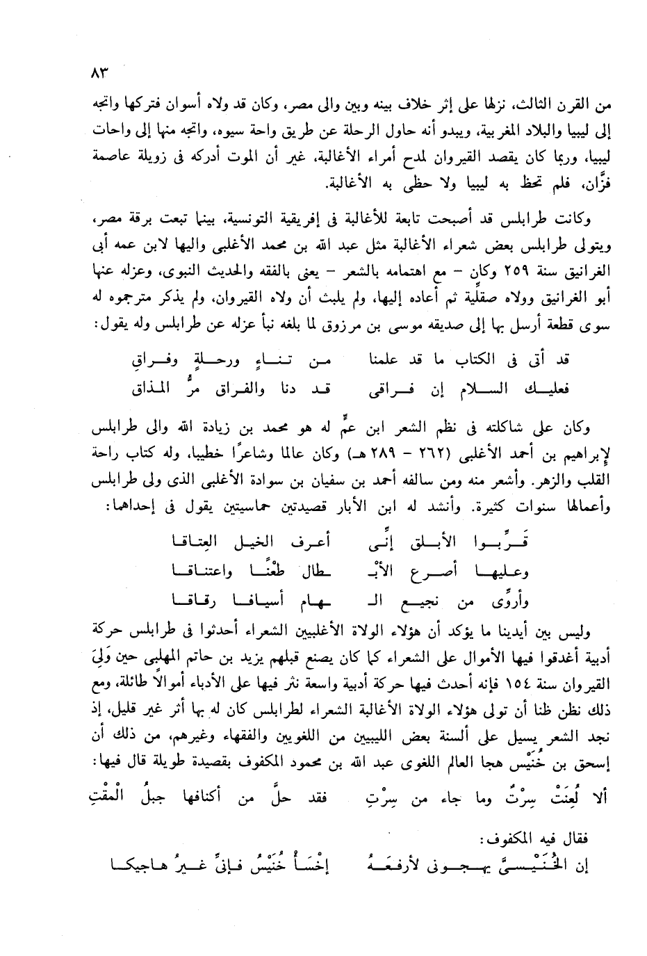 وكانت طرابلس قد أصبحت تابعة للأغالبة فى إفريقية التونسية، بينما تبعت برقة مصر، ويتولى طرابلس بعض شعراء الأغالبة مثل عبد الله بن محمد الأغلبى واليها لابن عمه أبى الغرانيق سنة 259 وكان-مع اهتمامه بالشعر-يعنى بالفقه والحديث النبوى، وعزله عنها أبو الغرانيق وولاه صقلّية ثم أعاده إليها، ولم يلبث أن ولاه القيروان، ولم يذكر مترجموه له سوى قطعة أرسل بها إلى صديقه موسى بن مرزوق لما بلغه نبأ عزله عن طرابلس وله يقول: