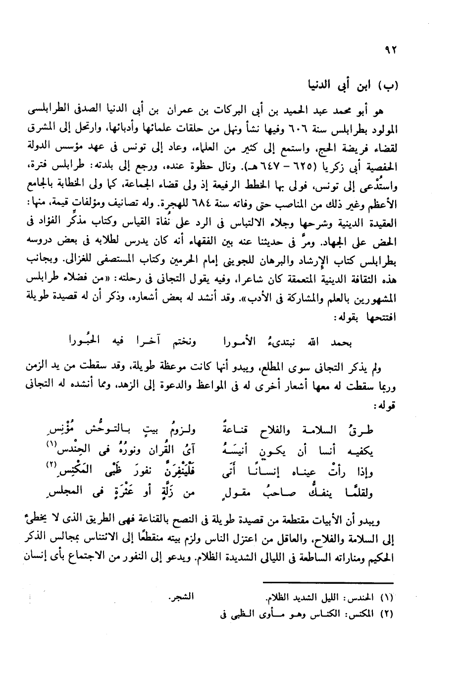 العقيدة الدينية وشرحها وجلاء الالتباس فى الرد على نفاة القياس وكتاب مذكّر الفؤاد فى الحض على الجهاد. ومرّ فى حديثنا عنه بين الفقهاء أنه كان يدرس لطلابه فى بعض دروسه بطرابلس كتاب الإرشاد والبرهان للجوينى إمام الحرمين وكتاب المستصفى للغزالى. وبجانب هذه الثقافة الدينية المتعمقة كان شاعرا، وفيه يقول التجانى فى رحلته: «من فضلاء طرابلس المشهورين بالعلم والمشاركة فى الأدب». وقد أنشد له بعض أشعاره، وذكر أن له قصيدة طويلة افتتحها بقوله: