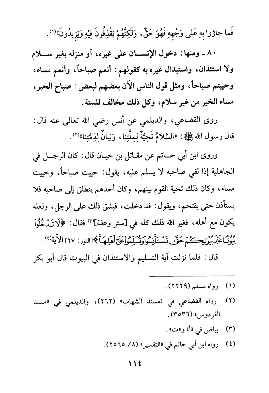 80 - ومنها: دخول الإنسان على غيره، أو منزله بغير سلام ولا استئذان، واستبدال غيره به كقولهم: أنعم صباحًا، وأنعم مساء، وحييتم صباحًا، ومثل قول الناس الآن بعضهم لبعض: صباح الخير، مساء الخير من غير سلام، وكل ذلك مخالف للسنة.