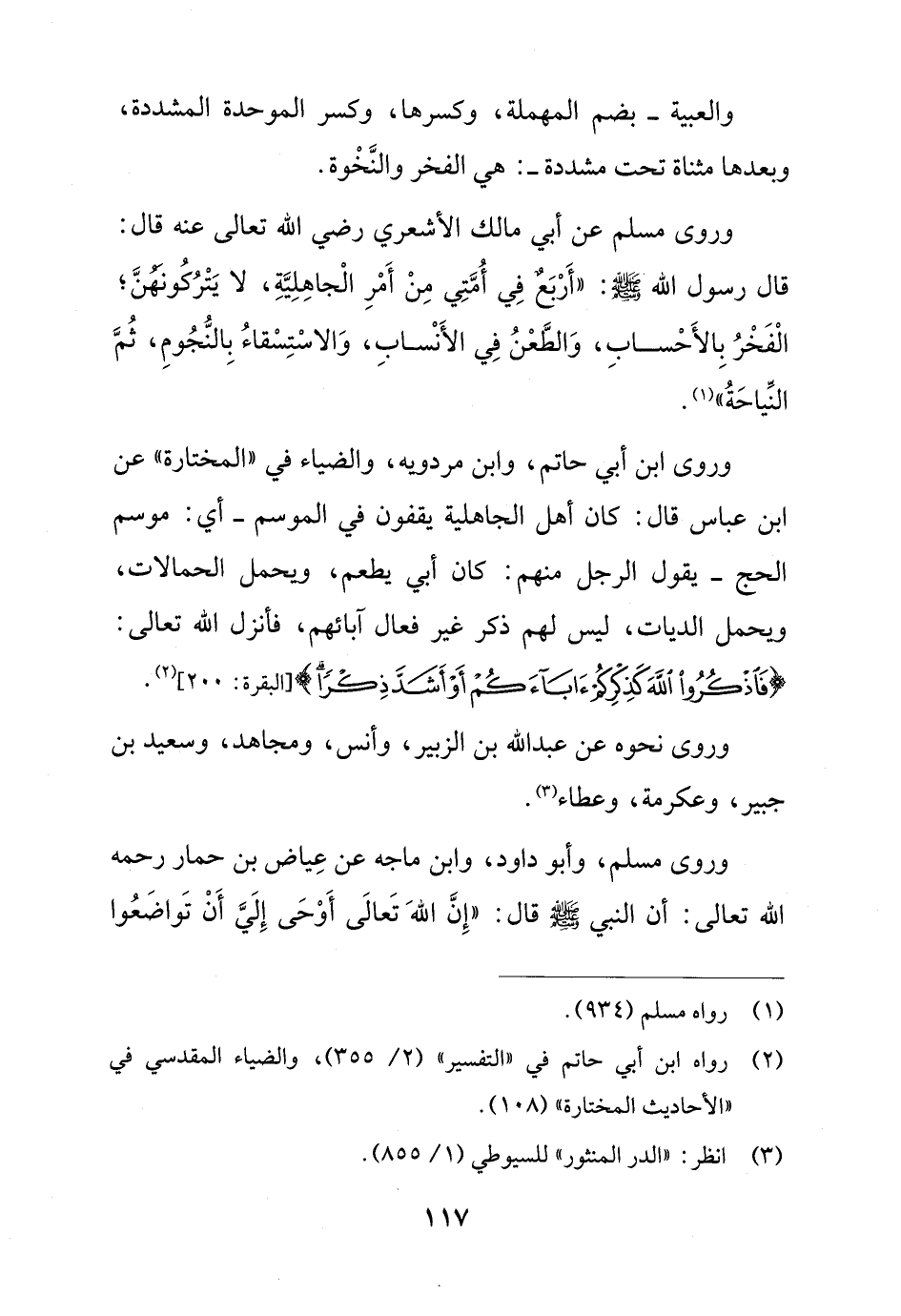وروى مسلم عن أبي مالك الأشعري رضي الله تعالى عنه قال: قال رسول الله - صلى الله عليه وسلم -: "أَرْبَعٌ فِي أُمَّتِي مِنْ أَمْرِ الْجاهِلِيَّةِ، لا يَتْرُكُونهنَّ؛ الْفَخْرُ بِالأَحْسابِ، وَالطَّعْنُ فِي الأَنْسابِ، وَالاسْتِسْقاءُ بِالنُّجُومِ، ثُمَّ النِّياحَةُ" (¬1).