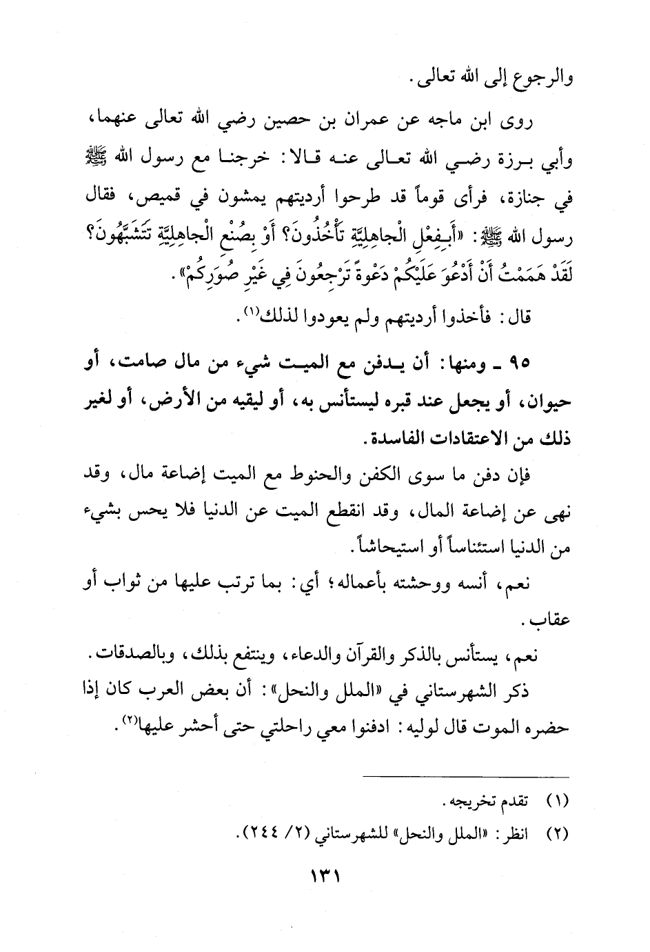 95 - ومنها: أن يدفن مع الميت شيء من مال صامت، أو حيوان، أو يجعل عند قبره ليستأنس به، أو ليقيه من الأرض، أو لغير ذلك من الاعتقادات الفاسدة.