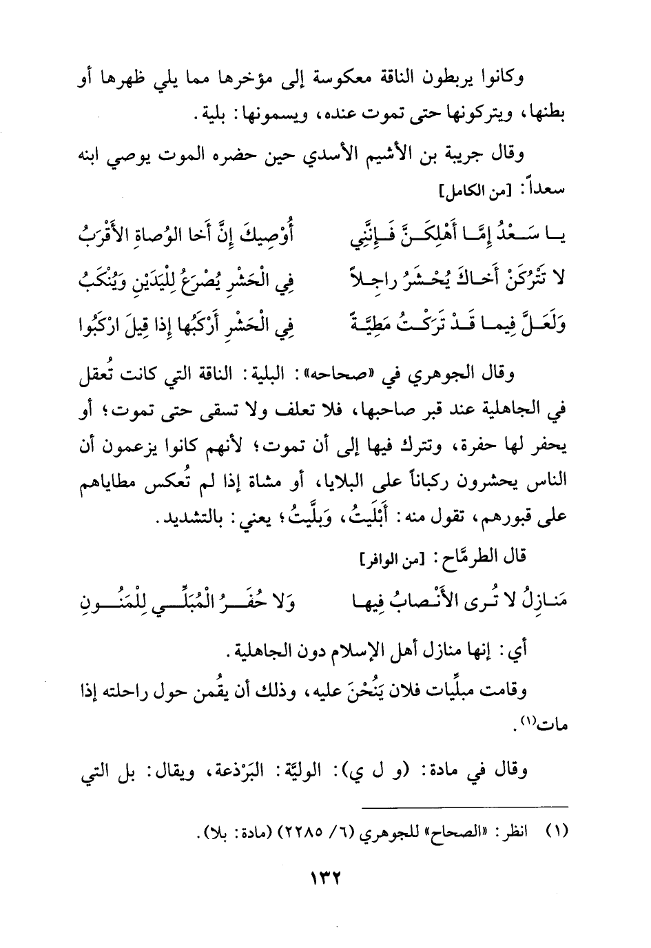 وقال الجوهري في "صحاحه": البلية: الناقة التي كانت تُعقل في الجاهلية عند قبر صاحبها، فلا تعلف ولا تسقى حتى تموت؛ أو يحفر لها حفرة، وتترك فيها إلى أن تموت؛ لأنهم كانوا يزعمون أن الناس يحشرون ركبانًا على البلايا، أو مشاة إذا لم تُعكس مطاياهم على قبورهم، تقول منه: أَبْلَيتُ، وَبلَّيتُ؛ يعني: بالتشديد.