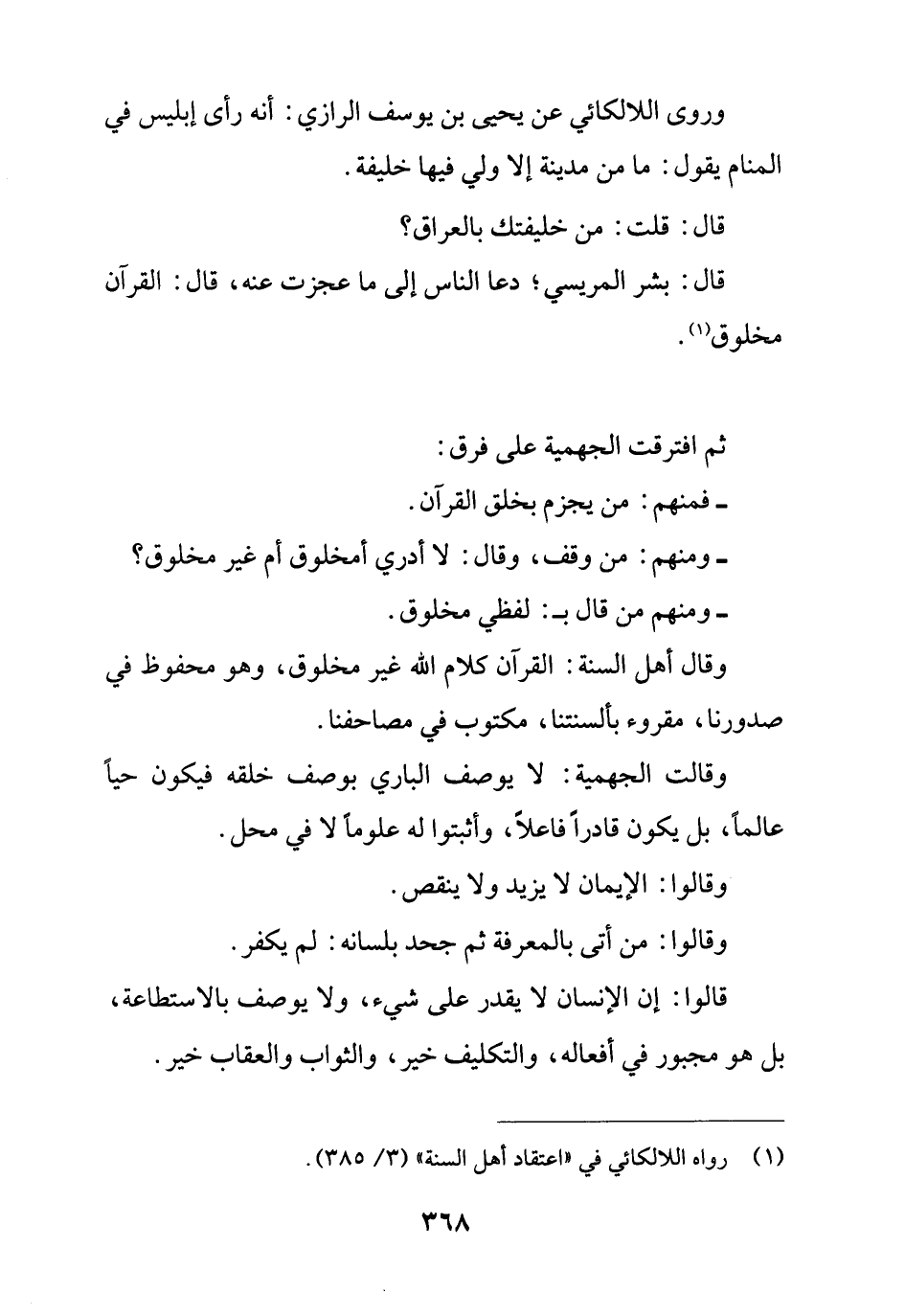 وقال أهل السنة: القرآن كلام الله غير مخلوق، وهو محفوظ في صدورنا، مقروء بألسنتنا، مكتوب في مصاحفنا.