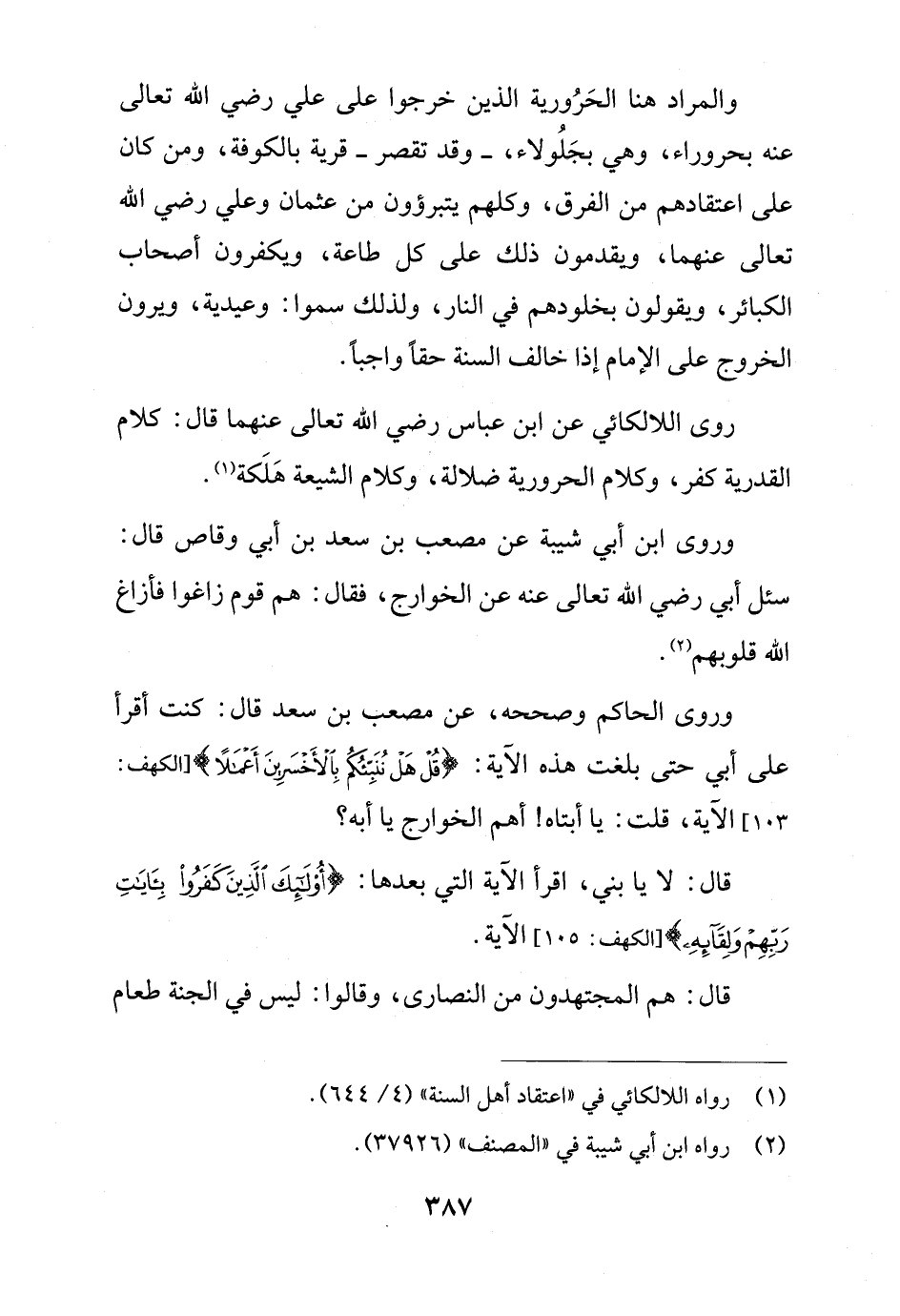 وروى ابن أبي شيبة عن مصعب بن سعد بن أبي وقاص قال: سئل أبي رضي الله تعالى عنه عن الخوارج، فقال: هم قوم زاغوا فأزاغ الله قلوبهم (¬2).