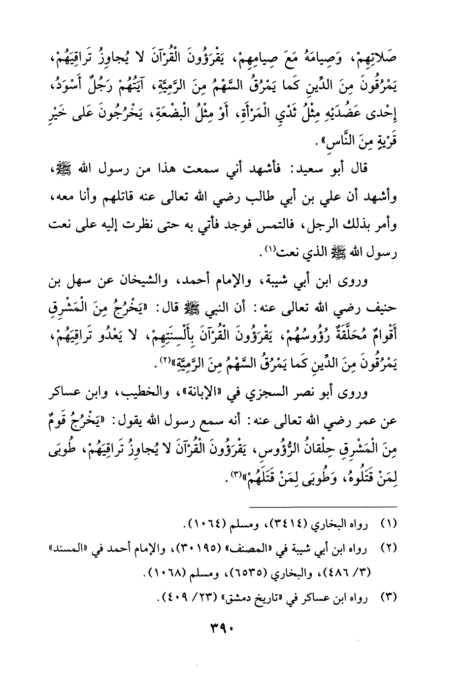وروى ابن أبي شيبة، والإمام أحمد، والشيخان عن سهل بن حنيف رضي الله تعالى عنه: أن النّبيّ - صلى الله عليه وسلم - قال: "يَخْرُجُ مِنَ الْمَشْرِقِ أَقْوامٌ مُحَلَّقَةٌ رُؤُوسُهُمْ، يَقْرَؤُونَ الْقُرْآنَ بِأَلْسِنَتِهِمْ، لا يَعْدُو تَراقِيَهُمْ، يَمْرُقُونَ مِنَ الدِّينِ كَما يَمْرُقُ السَّهْمُ مِنَ الرَّمِيَّةِ" (¬2).