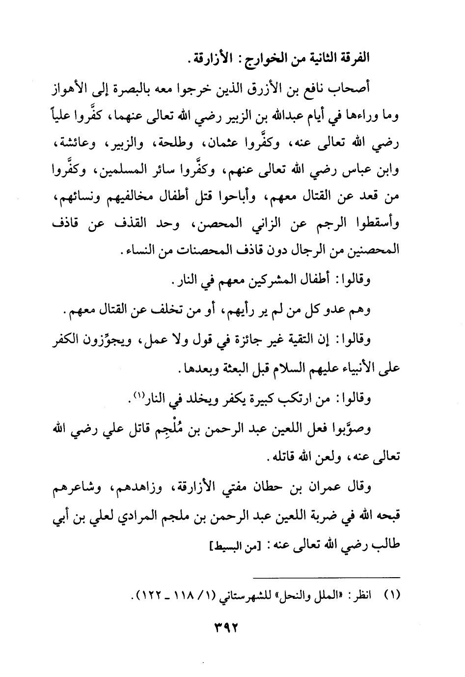 أصحاب نافع بن الأزرق الذين خرجوا معه بالبصرة إلى الأهواز وما وراءها في أيّام عبد الله بن الزبير رضي الله تعالى عنهما، كفَّروا عليًا رضي الله تعالى عنه، وكفروا عثمان، وطلحة، والزبير، وعائشة، وابن عبّاس رضي الله تعالى عنهم، وكفَّروا سائر المسلمين، وكفَّروا من قعد عن القتال معهم، وأباحوا قتل أطفال مخالفيهم ونسائهم، وأسقطوا الرَّجْم عن الزاني المحصن، وحد القذف عن قاذف المحصنين من الرجال دون قاذف المحصنات من النِّساء.