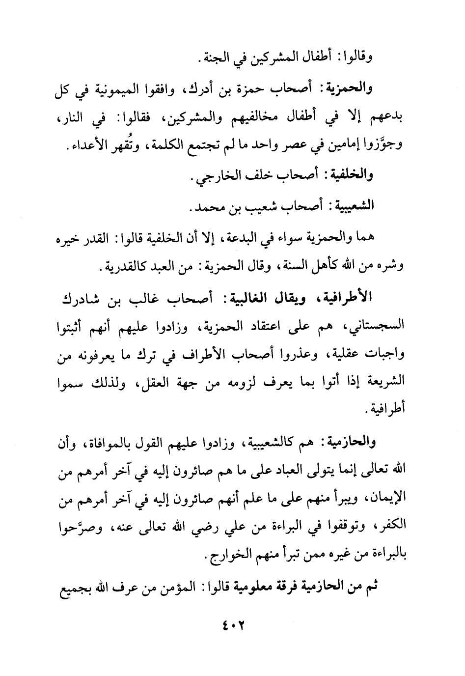 والحمزية: أصحاب حمزة بن أدرك، وافقوا الميمونية في كلّ بدعهم إِلَّا في أطفال مخالفيهم والمشركين، فقالوا: في النّار، وجوَّزوا إمامين في عصر واحد ما لم تجتمع الكلمة، وتُقهر الأعداء.