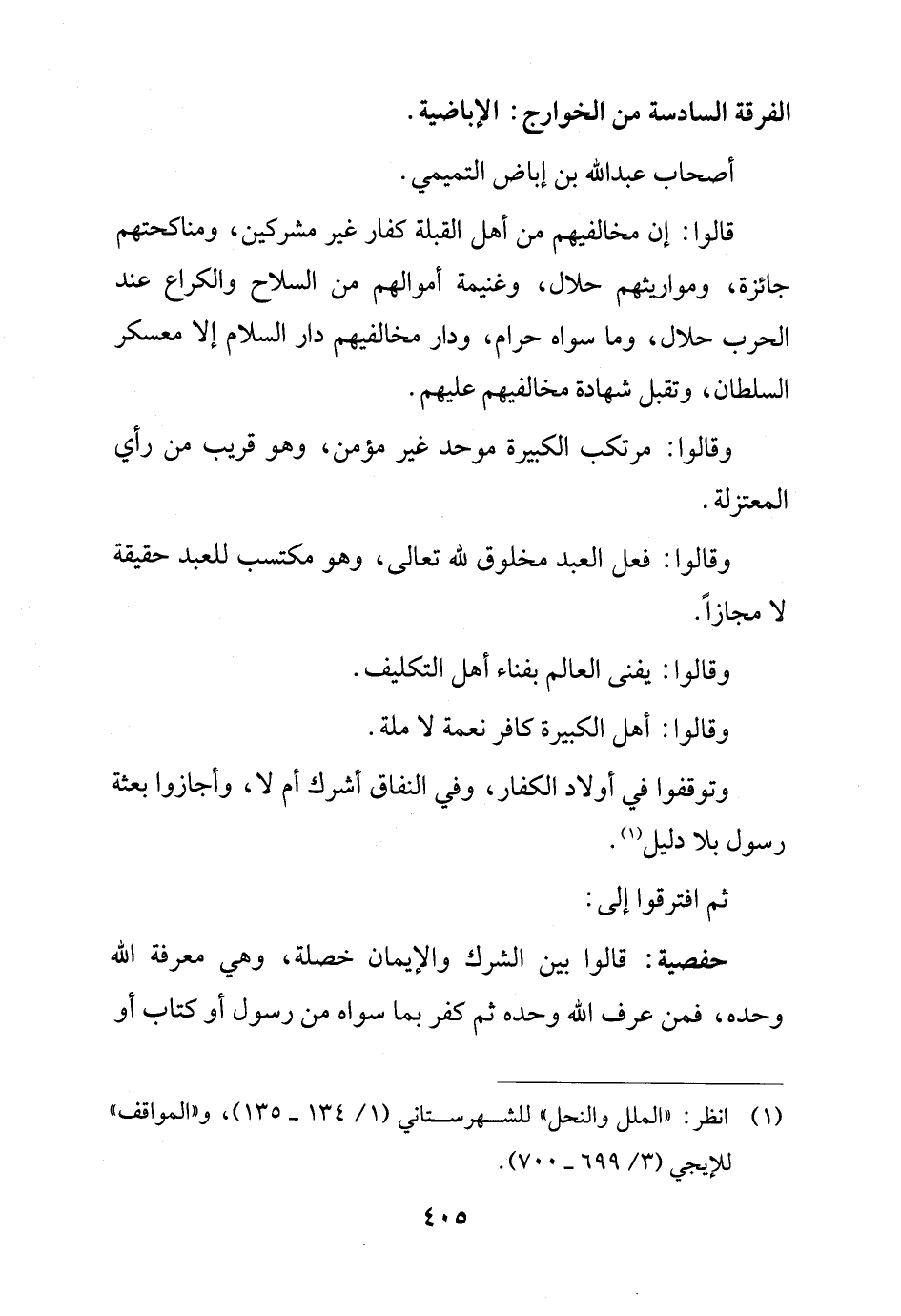 (¬1) انظر: "الملل والنحل" للشهرستاني (1/ 134 - 135)، و"المواقف" للإيجي (3/ 699 - 700).