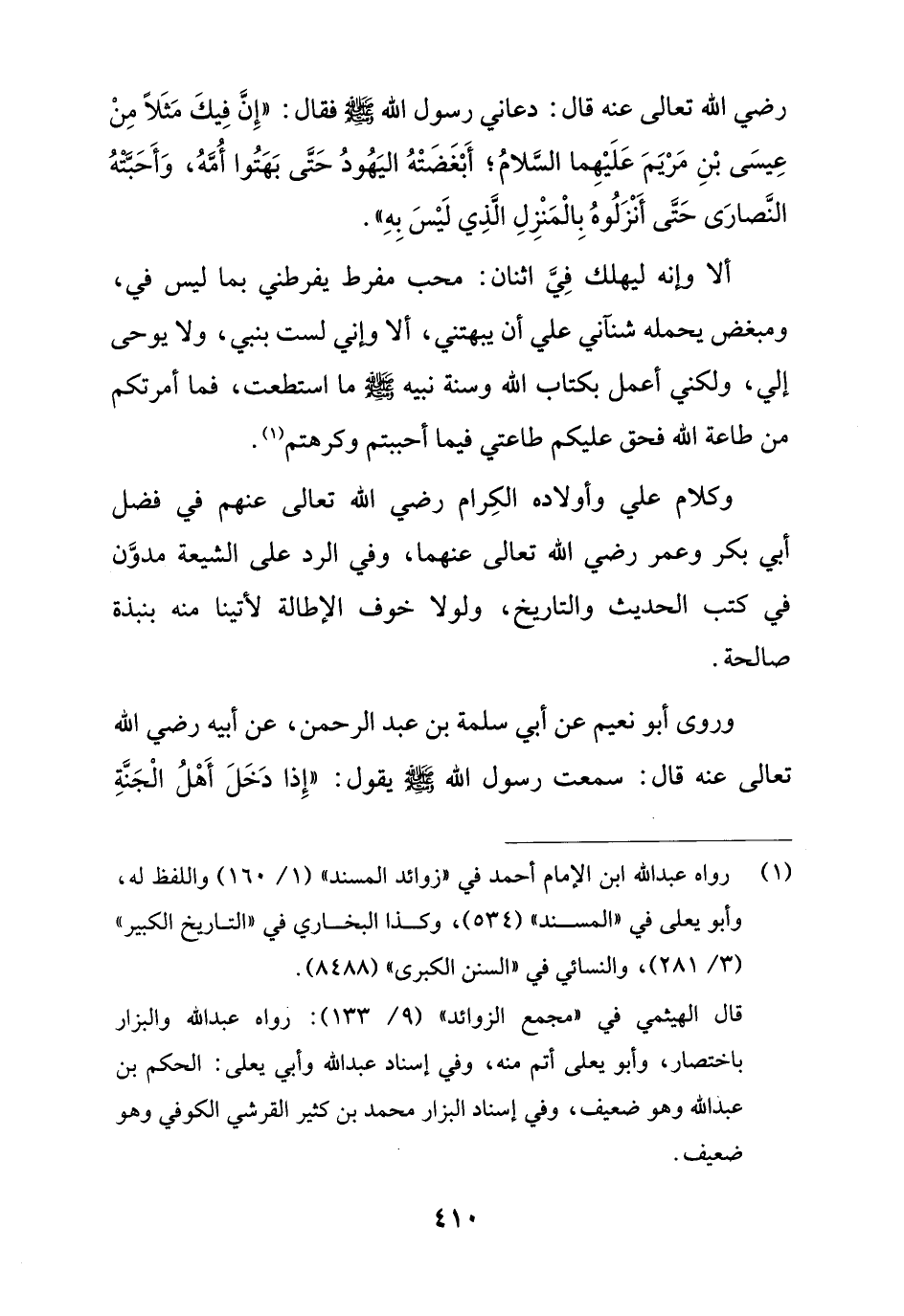 وكلام علي وأولاده الكِرام رضي الله تعالى عنهم في فضل أبي بكر وعمر رضي الله تعالى عنهما، وفي الرَّدِّ على الشيعة مدوَّن في كتب الحديث والتاريخ، ولولا خوف الإطالة لأتينا منه بنبذة صالحة.