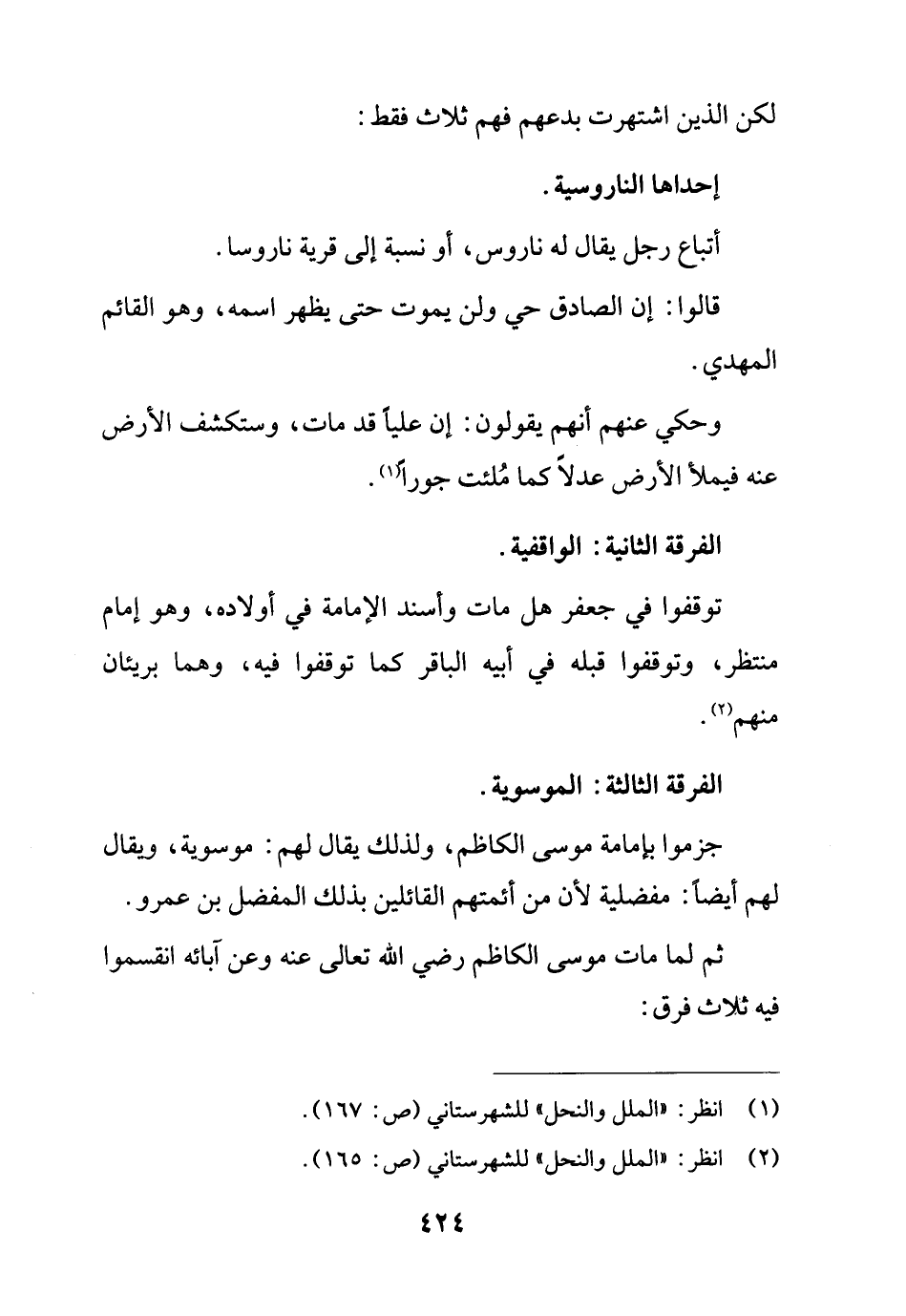 ثمّ لما مات موسى الكاظم رضي الله تعالى عنه وعن آبائه انقسموا فيه ثلاث فرق: