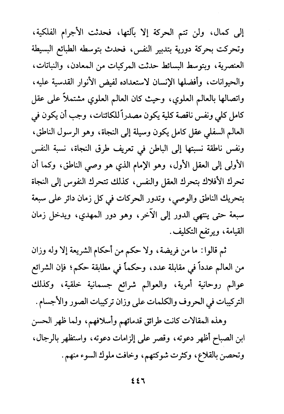 إلى كمال، ولن تتم الحركة إِلَّا بآلتها، فحدثت الأجرام الفلكية، وتحركت بحركة دورية بتدبير النفس، فحدث بتوسطه الطبائع البسيطة العنصرية، وبتوسط البسائط حدثت المركبات من المعادن، والنباتات، والحيوانات، وأفضلها الإنسان لاستعداده لفيض الأنوار القدسية عليه، واتصالها بالعالم العلّوي، وحيث كان العالم العلّوي مشتملًا على عقل كامل كلي ونفس ناقصة كلية يكون مصدرًا للكائنات، وجب أن يكون في العالم السفلي عقل كامل يكون وسيلة إلى النجاة، وهو الرسول الناطق، ونفس ناطقة نسبتها إلى الباطن في تعريف طرق النجاة، نسبة النفس الأولى إلى العقل الأوّل، وهو الإمام الّذي هو وصي الناطق، وكما أن تحرك الأفلاك بتحرك العقل والنفس، كذلك تتحرك النفوس إلى النجاة بتحريك الناطق والوصي، وتدور الحركات في كلّ زمان دائر على سبعة سبعة حتّى ينتهي الدور إلى الآخر، وهو دور المهدي، ويدخل زمان القيامة، ويرتفع التكليف.