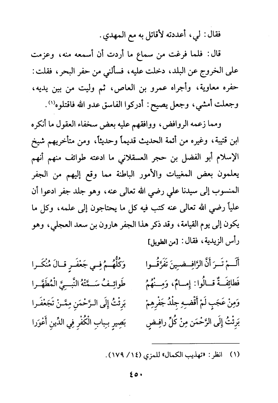 ومما زعمه الروافض، ووافقهم عليه بعض سخفاء العقول ما أنكره ابن قتيبة، وغيره من أئمة الحديث قديمًا وحديثًا، ومن متأخريهم شيخ الإسلام أبو الفضل بن حجر العسقلاني ما ادعته طوائف منهم أنّهم يعلمون بعض المغيبات والأمور الباطنة ممّا وقع إليهم من الجفر المنسوب إلى سيدنا علي رضي الله تعالى عنه، وهو جلد جفر ادعوا أن عليًا رضي الله تعالى عنه كتب فيه كلّ ما يحتاجون إلى علمه، وكل ما يكون إلى يوم القيامة، وقد ذكر هذا الجفر هارون بن سعد العجلي، وهو رأس الزيدية، فقال: [من الطويل]
