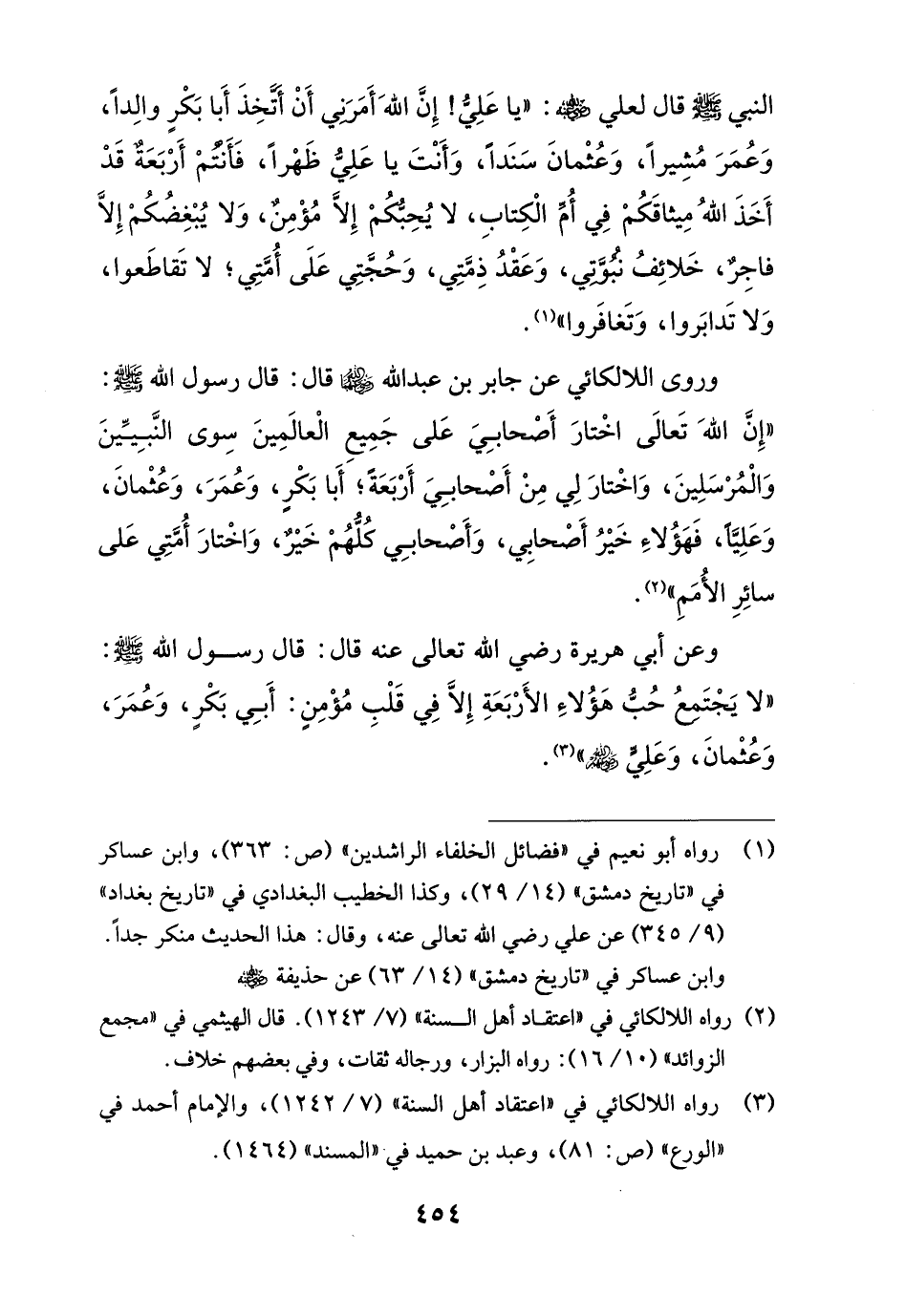 النّبيّ - صلى الله عليه وسلم - قال لعلّي - رضي الله عنه -: "يا عَلِىُّ! إِنَّ اللهَ أَمَرَنِي أَنْ أَتَّخِذَ أَبا بَكْرٍ والِدًا، وَعُمَرَ مُشِيرًا، وَعُثْمانَ سَنَدًا، وَأَنْتَ يا عَلِيُّ ظَهْرًا، فَأَنْتُمْ أَرْبَعَة قَدْ أَخَذَ اللهُ مِيثاقَكُمْ فِي أُمِّ الْكِتابِ، لا يُحِبُّكُمْ إِلَّا مُؤْمِنٌ، وَلا يُبْغِضُكُمْ إِلَّا فاجِرٌ، خَلائِفُ نُبُوَّتي، وَعَقْدُ ذِمَّتِي، وَحُجَّتِي عَلَى أُمَّتِي؛ لا تَقاطَعوا، وَلا تَدابَروا، وَتَغافَروا" (¬1).