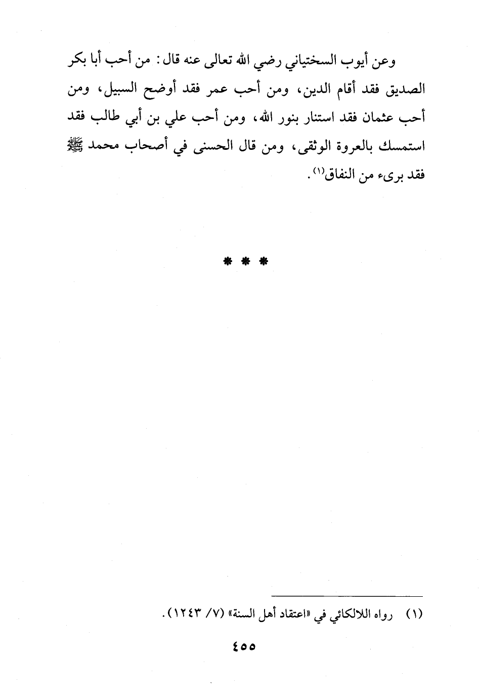 وعن أيوب السختياني رضي الله تعالى عنه قال: من أحب أبا بكر الصديق فقد أقام الدِّين، ومن أحب عمر فقد أوضح السبيل، ومن أحب عثمان فقد استنار بنور الله، ومن أحب علي بن أبي طالب فقد استمسك بالعروة الوثقى، ومن قال الحسنى في أصحاب محمّد - صلى الله عليه وسلم - فقد برئ من النفاق (¬1).