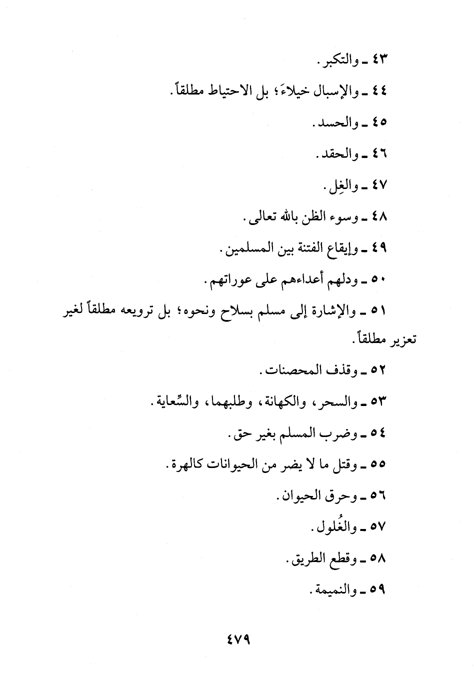 51 - والإشارة إلى مسلم بسلاح ونحوه؛ بل ترويعه مطلقًا لغير تعزير مطلقًا.