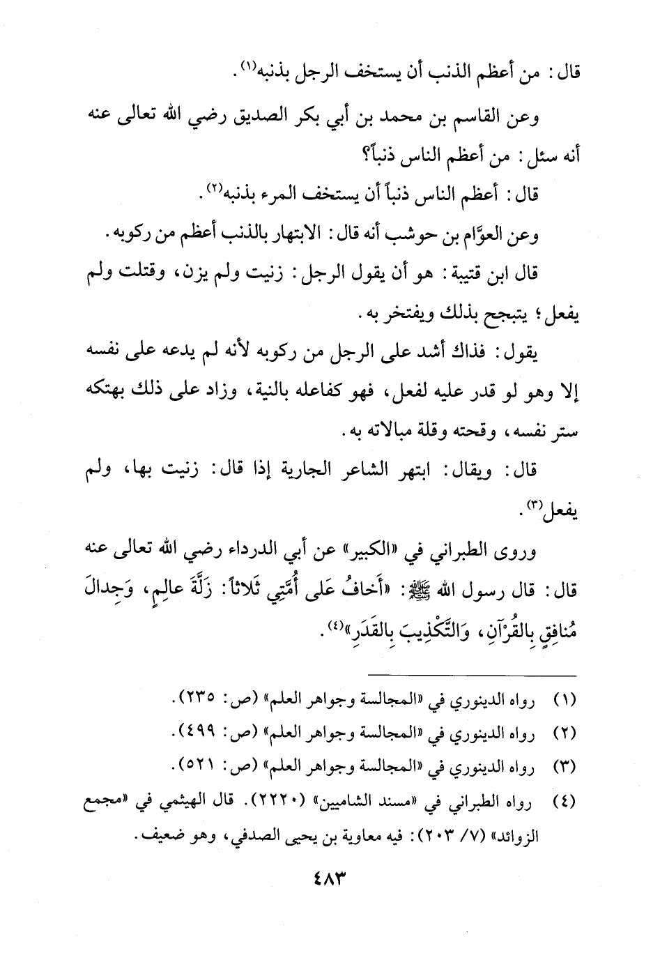 وعن القاسم بن محمّد بن أبي بكر الصديق رضي الله تعالى عنه أنّه سئل: من أعظم النَّاس ذنبًا؟ قال: أعظم النَّاس ذنبًا أن يستخف المرء بذنبه (¬2).